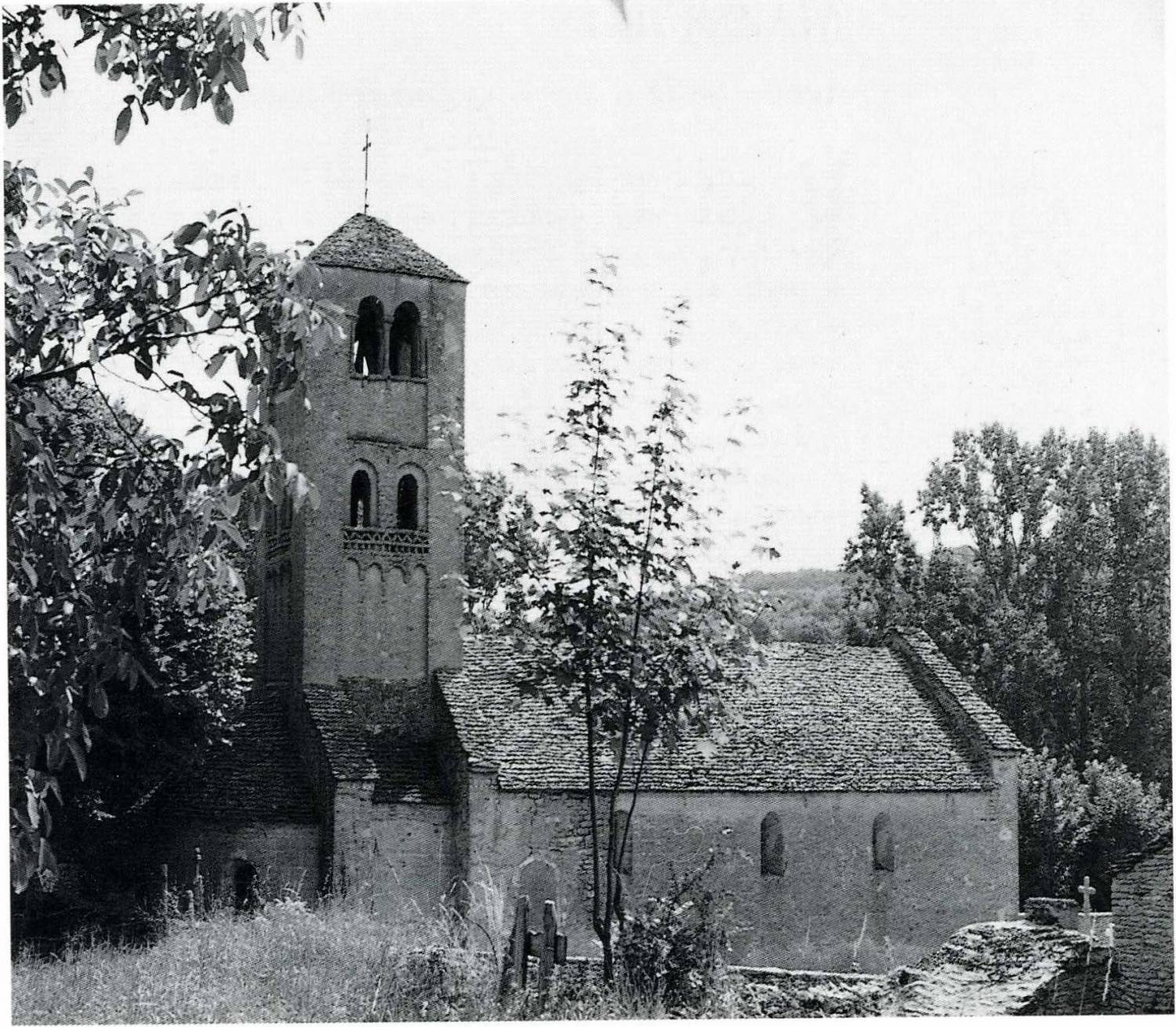 Située à huit kilomètres de Cluny, l’église Saint-Denis de Massy est un petit édifice homogène du XIe s., formé d’une nef plafonnée suivie d’une travée de chœur voûtée en berceau soutenant le clocher et d’une abside hémicirculaire couverte d’un cul-de-four. Toutes les fenêtres, en plein cintre, sont très étroites, ébrasées à l’intérieur et à l’extérieur. La façade, très simple, est percée d’une porte surmontée d’une petite fenêtre qui éclaire la nef, toutes deux en plein cintre également. La travée droite du chœur qui supporte le clocher est soutenue sur chacun de ses côtés par deux puissants contreforts, qui sont les seuls que comporte l’édifice. Elle ouvre au sud sur une chapelle ajoutée au XVe s. et où l’on pénètre par une jolie porte en accolade et pinacles flamboyants. Le clocher, de plan carré, se compose d’un soubassement plein encadré par des bandes lombardes, puis, après deux rangs de pierres disposées comme à Saint-Philibert de Tournus en dents de scie et en chevrons, de deux étages ouverts de baies. Le tout est construit en petits moellons et couvert de laves. L’église contient un bénitier en pierre posé sur un fût cylindrique dont la base est sculptée, qui pourrait dater de l’époque de la construction ; le maître-autel, quant à lui, remonte au XVIIe s. L’église est inscrite à l’inventaire supplémentaire des Monuments historiques depuis le 29 octobre 1926. La réfection de sa toiture en laves, devenue indispensable, représentait une lourde charge pour cette petite commune. La Sauvegarde de l’Art français lui a accordé une aide de 100 000 F en 1988.
