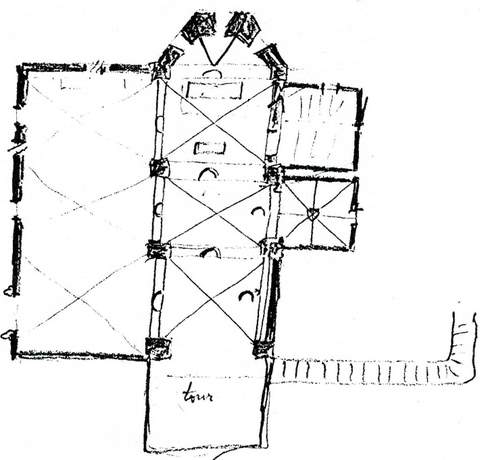 L’accès primitif de l’église castrale était au sud, sur la cour du château, au niveau de la dernière travée. L’ouverture a été bouchée, mais l’arcade subsiste. L’accès actuel, au nord, date du XIXe s. : sommaire à l’intérieur, il est habillé à l’extérieur dans le style gothique.