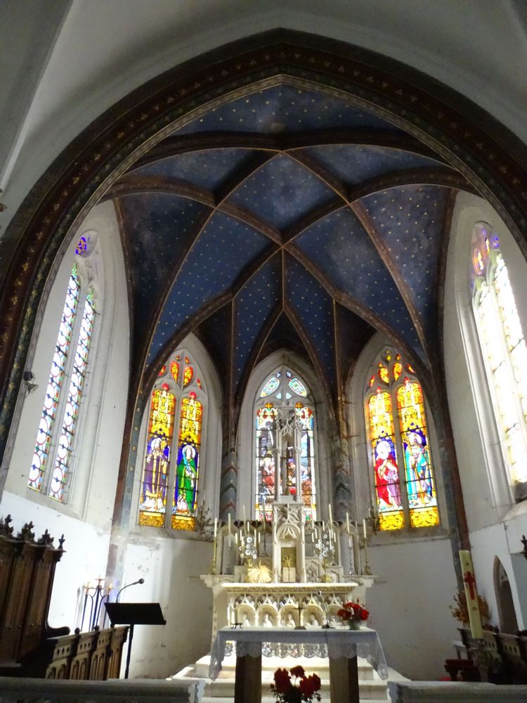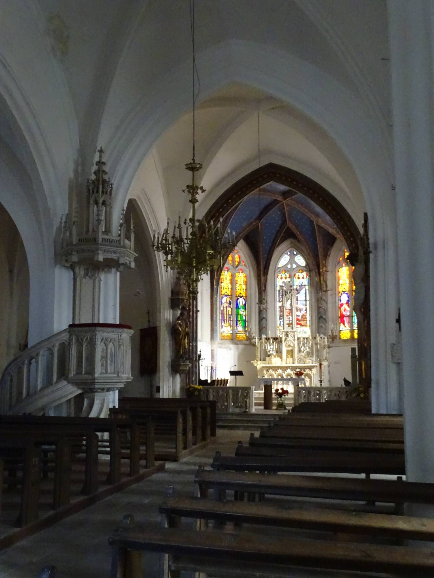 Elle est constituée d’un clocher-porche néogothique, suivi d’une nef flanquée de deux collatéraux et d’un choeur pentagonal voûté.