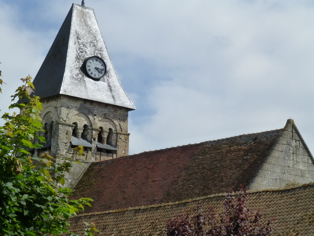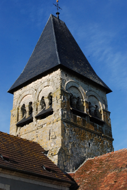 Le clocher de style roman, de plan carré, est ouvert sur ses 4 faces de 2 baies géminées et cintrées, aux chapiteaux sculptés. La corniche est formée d’arcades inscrivant des contre-corbeaux aigus (ornements en saillie) et appuyé sur des corbeaux plats à dessins variés.