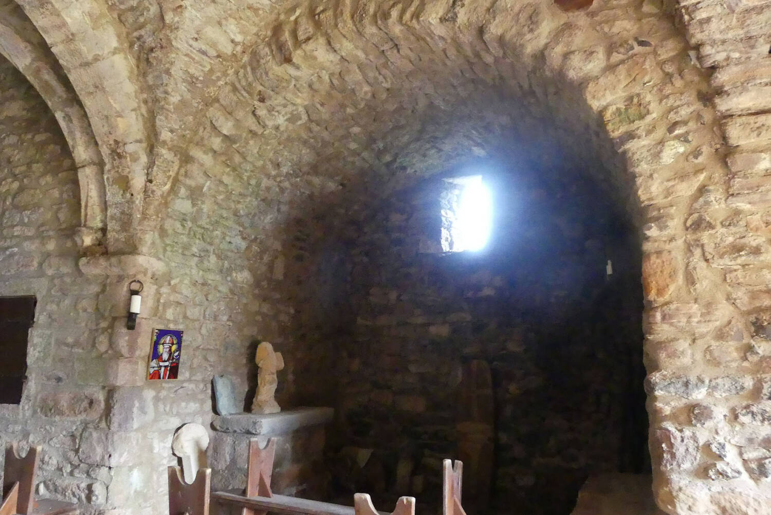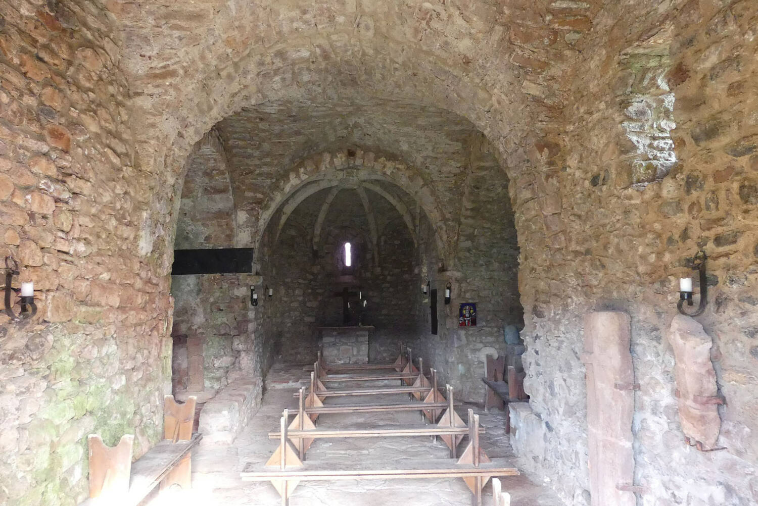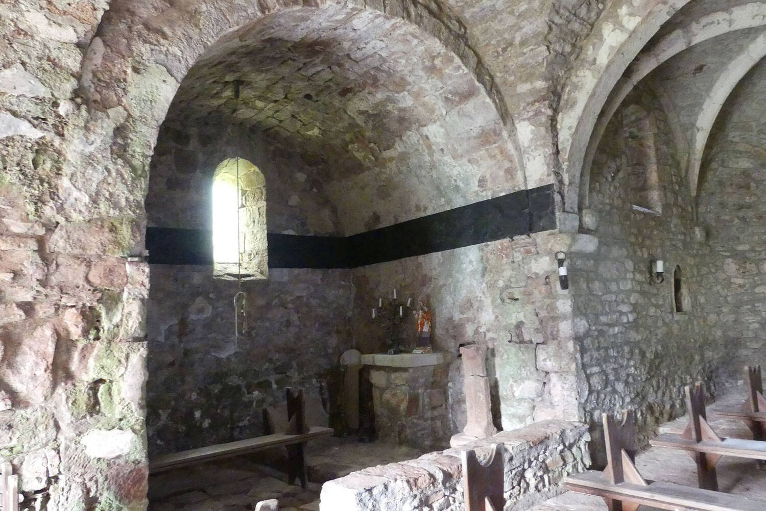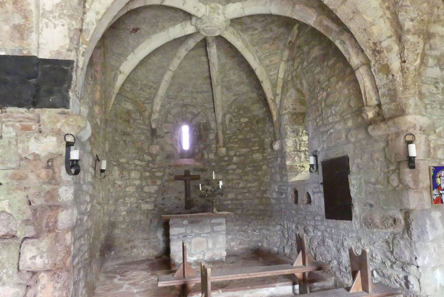La chapelle Saint-Pierre de Mérifons adopte un plan en croix latine orienté à l’Est-Nord-Est, avec une silhouette trapue et une toiture en lauzes. Construite en moellons variés (grès, pélite, basalte), elle possède une nef à deux travées voûtées d’arêtes formant le transept, flanquée de deux chapelles latérales en berceau brisé, dont la chapelle nord supporte le clocher. Le chœur se termine par une abside semi-circulaire voûtée d’une nervure à six pans avec clef sculptée, et le sol est dallé de pierre.