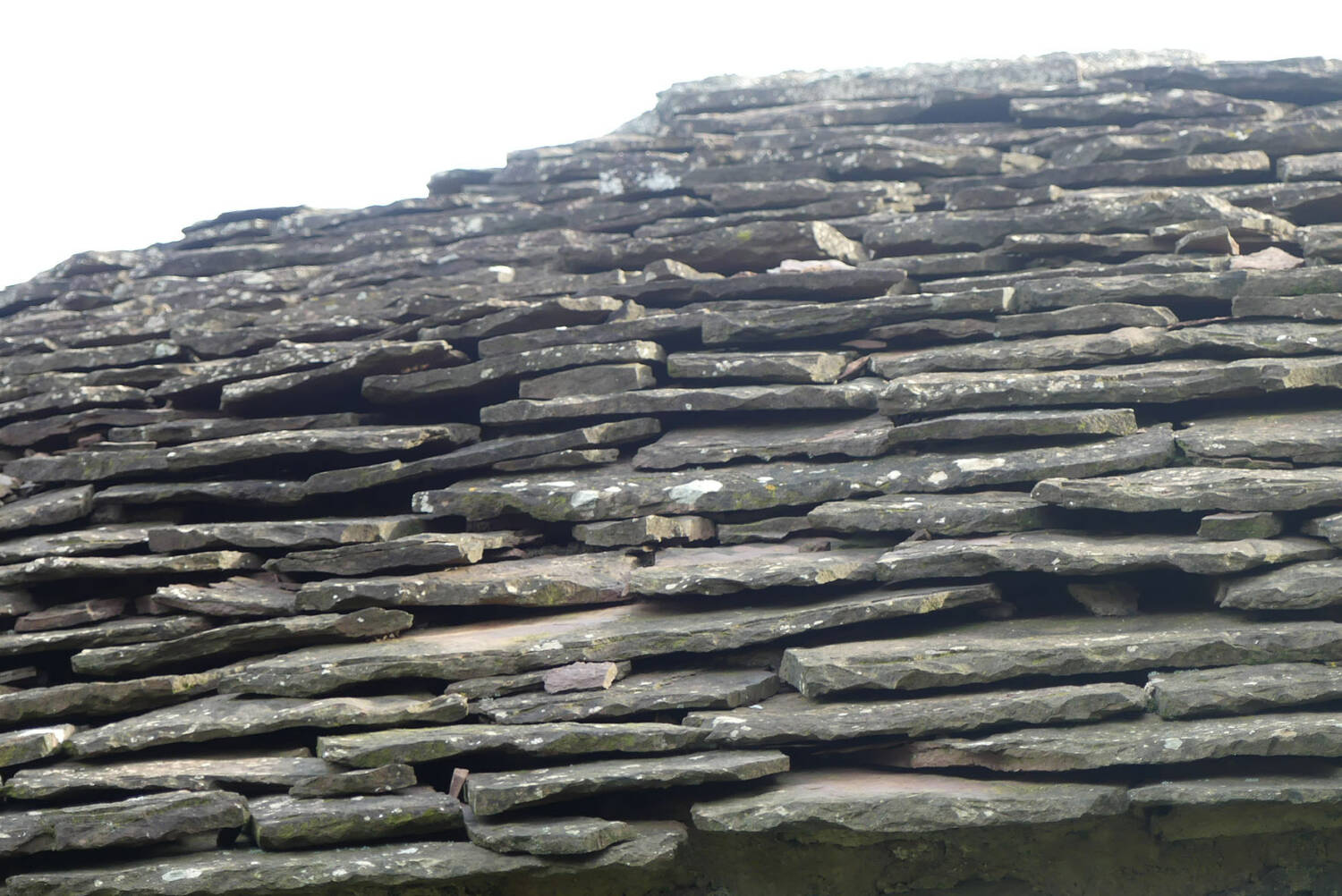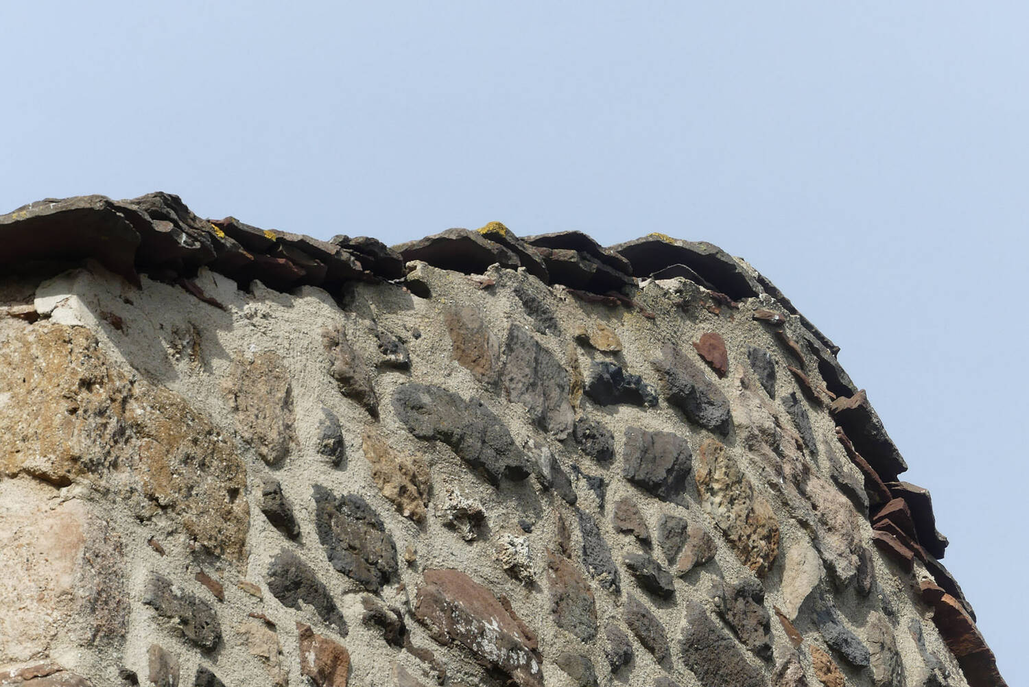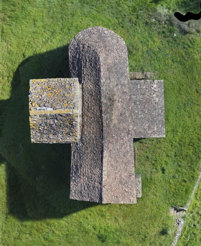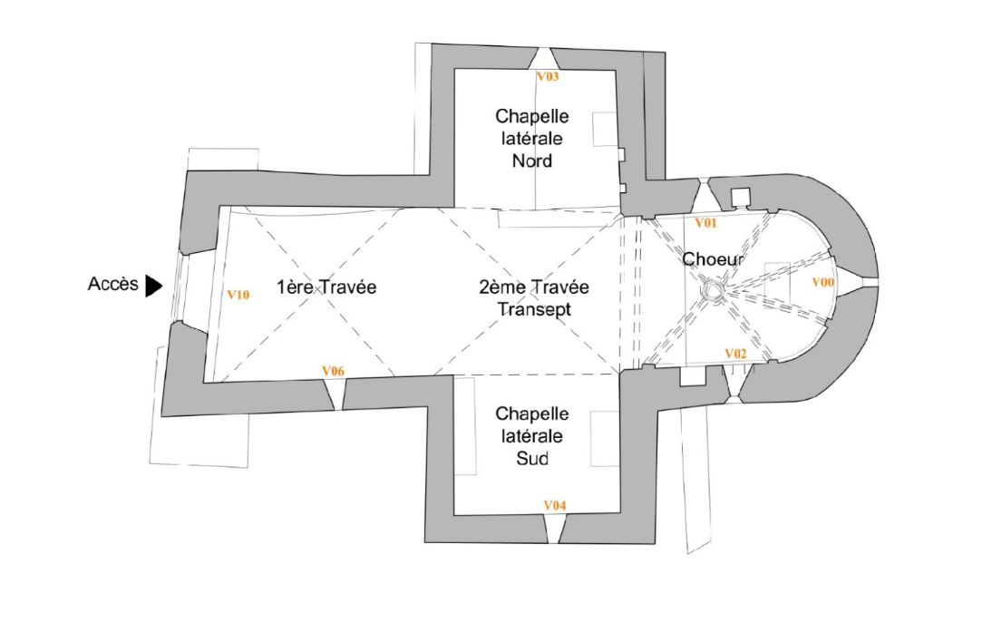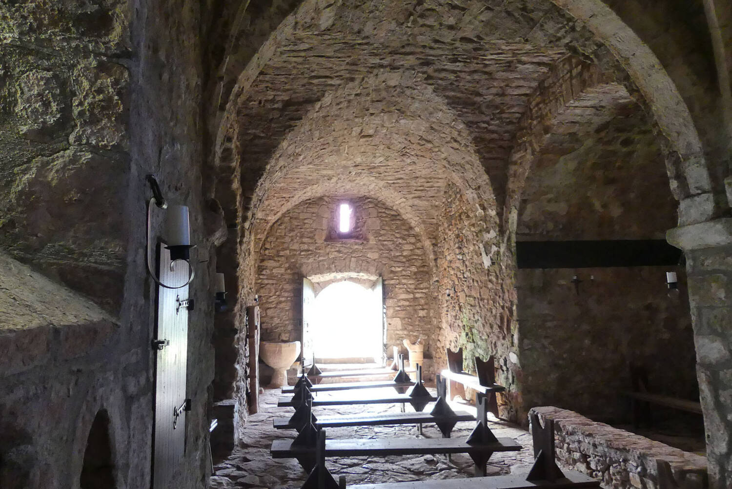 La chapelle Saint-Pierre de Mérifons adopte un plan en croix latine orienté à l’Est-Nord-Est, avec une silhouette trapue et une toiture en lauzes. Construite en moellons variés (grès, pélite, basalte), elle possède une nef à deux travées voûtées d’arêtes formant le transept, flanquée de deux chapelles latérales en berceau brisé, dont la chapelle nord supporte le clocher. Le chœur se termine par une abside semi-circulaire voûtée d’une nervure à six pans avec clef sculptée, et le sol est dallé de pierre.