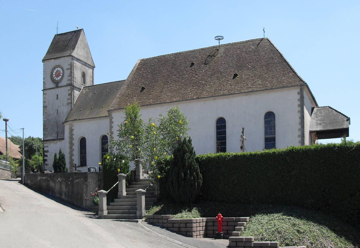 Les poteaux porteurs de celui-ci s’appuient des bases maçonnées assises sur le mur de soutènement, et la toiture à demi-croupe du porche est couverte en tuiles plates « Biberschwantz » comme le reste de l’édifice.