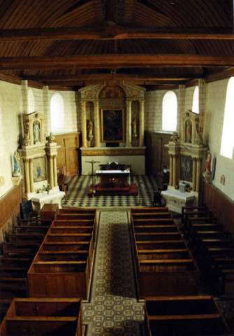 À l’intérieur, le vaisseau est couvert d’une voûte en charpente lambrissée dont le décor au pochoir semble dater de la fin du XIXe siècle.