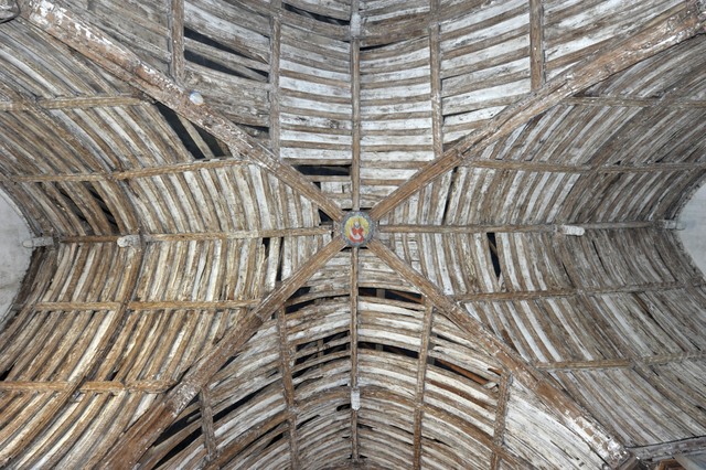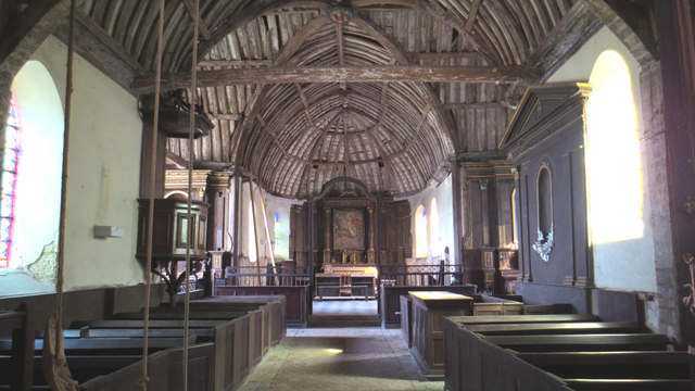L’intérieur est entièrement couvert d’une magnifique voûte en berceau brisé à charpente apparente, du milieu du XVIe siècle ; elle est montée sur un réseau de liernes et de cerces transversales moulurées où subsistent des traces de peinture rouge. Au centre du transept, elle est ornée d’un médaillon en bas-relief polychrome figurant Dieu le Père en buste, coiffé d’ une couronne, tenant le globe terrestre et bénissant le Monde. Elle conserve également quelques culs-de-lampe décorés de feuillages. Elle avait été recouverte de plâtre au XIXe siècle, mais fut entièrement dégagée en 2007. A l’entrée de la nef, un tabouret de six poteaux supporte le clocher. Pour des raisons de sécurité, l’église a été fermée en 2005. Au XVIIIe siècle, d’importants travaux de réaménagement intérieur, notamment l’installation de retables, ont entraîné l’occultation des fenêtres, des deux transepts et de l’abside. Le retable de l’autel majeur présente un tableau figurant la Résurrection, encadré des statues de saint Aubin et de saint Charles-Borromée. Deux vitraux du XIXe siècle à l’effigie de saint Aubin et saint Barnabé ornent deux des fenêtres du chœur. L’église conserve une belle statue en bois de sainte Catherine d’Alexandrie du début du XVIe siècle, ainsi qu’une Vierge à l’Enfant et un saint Nicolas.