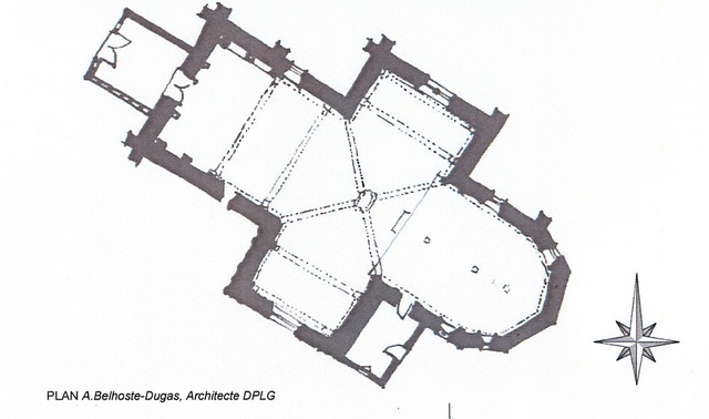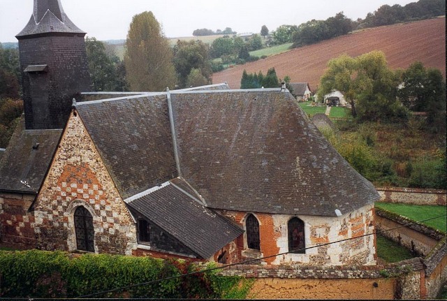 Mentionnée dans un document de 1290, elle a été complètement reconstruite au XVIe siècle avec un appareil en damiers ou en bandes horizontales alternées, constitué de blocs de calcaire blanc, de briques rouges, de blocs de grès ferrugineux bruns et de petits silex gris-bleu dont la régularité est inégale selon les secteurs.