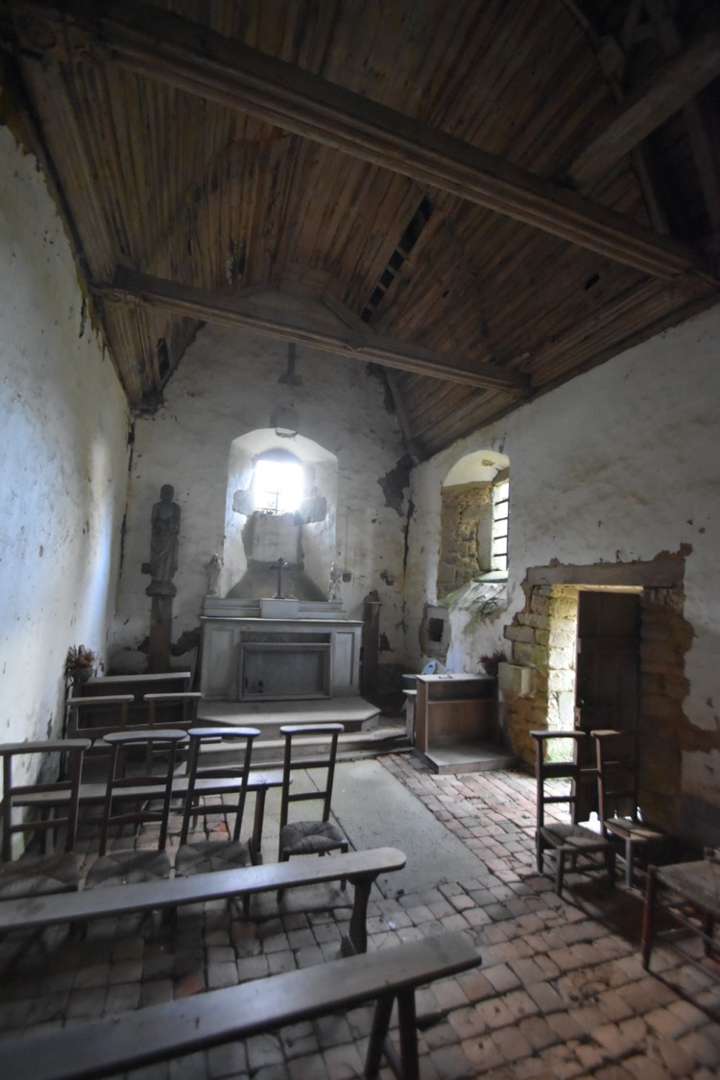 De plan rectangulaire, la chapelle est coiffée en bâtière. Les pignons est et ouest sont sommés d’une croix qui surmonte, à l’ouest, une petite chambre de cloche. Les rampants sont lisses. La porte d’entrée ouest, en plein cintre mouluré, peut être un remploi des 15e-16e siècles. Au sud, la porte rectangulaire et la petite fenêtre placée à l’est, de dimensions courantes au 17e siècle, très ébrasées à l’intérieur de l’édifice, sont également constituées de matériaux de remploi : piédroits chanfreinés en continu achevés d’une mouluration conique à la base de la porte ; jambages finement moulurés de la baie. La fenêtre du chevet a été partiellement murée. A l’intérieur, la nef est couverte d’une belle charpente sculptée datée du 17e siècle : sablières moulurées et entraits aux abouts décorés de palmettes et autres motifs géométriques. Elle présente une structure hexagonale reposant sur des fermes triangulées.