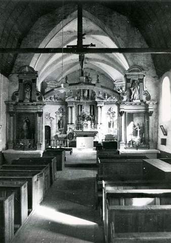 L’église Saint-Pierre de Miermaigne est l’un des édifices religieux les plus intéressants de cette partie du Perche. La nef, d’aspect encore roman, remonte en grande partie au xiiie s. Le chœur, de même longueur mais bien plus élevé que celle-ci, est une reconstruction des xvie et xviie s., à l’initiative de René de Bailleul, seigneur des Autels Tubœuf. Ses quatre fenêtres sont de style flamboyant. Les deux parties de l’édifice sont séparées par un arc brisé où prend place une poutre de gloire, en fait un arc de pierre surbaissé. Le décor du chœur est particulièrement remarquable : un retable à fronton brisé est surmonté de trois niches et entouré de deux crédences, près des portes richement ornées de la sacristie. Il s’agit là d’un superbe exemple de chœur salon, précédé, de chaque côté de la poutre de gloire, de deux petits retables. Ceux-ci témoignent de liturgies encore en usage au xviie s dans certains diocèses de la région. Ce décor exceptionnel nous est parvenu dans un état de conservation remarquable. Il n’en va malheureusement pas de même du reste de l’édifice, en péril depuis que des restaurateurs mal avisés, prenant prétexte des départs d’arcs encore visibles, entreprirent vers 1860 de remplacer la voûte de bois du chœur par des voûtains de briques recouverts de plâtre. Les contreforts, peu saillants, se révélèrent trop faibles pour supporter ce nouveau poids, et des désordres apparurent peu à peu dans la maçonnerie. Lorsque l’église fut inscrite à l’inventaire supplémentaire des Monuments historiques, en 1978, la première travée du chœur menaçait déjà de s’écrouler. Pour ces indispensables travaux de consolidation, la Sauvegarde de l’Art français a versé une subvention de 60 000 F.