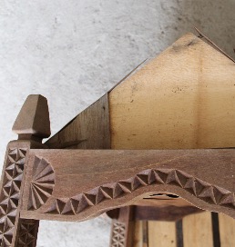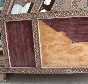 Le minbar a subi des dégradations sur certaines zones, probablement dû au fait qu’il soit resté dans la rue à l’abandon et à ciel ouvert en période de saison des pluies (kashikazi) avant l’arrivée de l’équipe du musée. On remarque des lacunes dans la marquèterie et une inscription au feutre de type « tag » faite probablement par un enfant du quartier. Le formica est arraché par endroit et se dédouble, gondole et tombe à d’autres à cause de la pluie et de l’humidité.