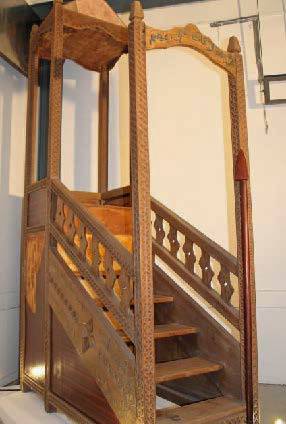 Le minbar est l’un des rares mobiliers qu’on trouve dans la salle de prière des mosquées, à Mayotte et dans la zone swahilie. Il sert de tribune au hatwiɓu (imam qui prononce sa hutuba, lors de la prière du vendredi (salat al-jumu’ah) et les jours de l’aïd. A Mayotte, il ne sert presqu’exclusivement qu’à cela. Il est placé dans la salle de prière, à droite du mihrab. Il peut aussi être sous forme de niche qui communique avec le mihrab. Ce minbar a été collecté par l’équipe du musée en 2017, à la mosquée du vendredi de Kawéni, une petite ville de la commune de Mamoudzou. Ce mobilier en bois comporte un escalier de sept marches et une assise avec la partie supérieure en pyramide auprès des fidèles de la mosquée. Le minbar est une sorte d’escabeau bâti réalisé soit en bois, soit en maçonnerie. Il est la plupart du temps décoré par des versets du Coran. Il peut être fixe ou mobile, posé ou encastré. A Mayotte, le minbar actuel de l’ancienne mosquée de Tsingoni est fait de maçonnerie, posé à droite du mihrab ; tandis que celui de la nouvelle mosquée est encastré. Si la centralité physique au sein de la mosquée accorde une importance au minbar, son rôle symbolique en octroie la solennité. En effet, c’est au-dessus de ce mobilier que se diffuse la parole sacrée, par le prêche, et des enseignements religieux.