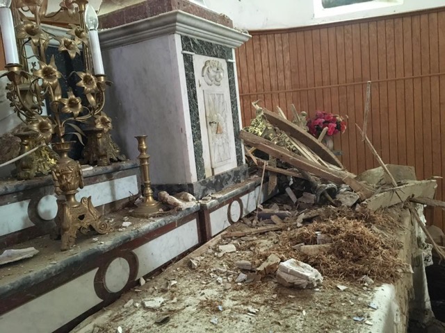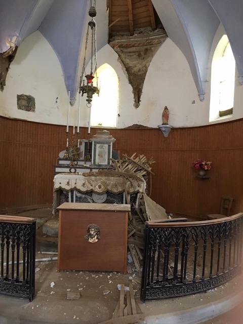 En 2018, suite à des fortes pluies, une partie de la voûte du choeur s’est écroulée sur l’autel. La dépose, par mesure de sécurité, de l’ensemble de la voûte, a révélé la présence d’infiltrations résultant d’une couverture défectueuses.