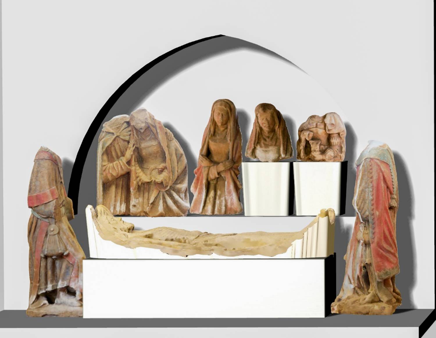 Les sept statues retrouvées sont datées stylistiquement du XVe siècle. Elles ont conservé leur polychromie d’origine (rouge et bleu-vert). Quatre d’entre elles ont perdu leurs têtes (il n’est pas impossible qu’elles soient dissimulées ailleurs dans la cathédrale). Les personnes sont Joseph d’Arimathie, Nicodème, la Vierge, saint Jean, Marie-Madeleine et deux saintes femmes. Ils portent tous de superbes bijoux et vêtements colorés. Certains personnages ont été sculptés en buste jusqu’aux genoux car ils devaient être disposés derrière le Christ (on économisait la matière au Moyen-Age). La physionomie des visages conservées, la qualité des drapés, les détails des vêtements permettent de dire que ces œuvres ont été réalisées par des sculpteurs talentueux.