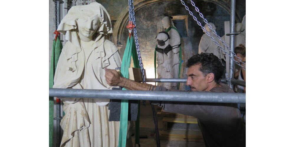 L’enfeu de la chapelle sud de l’église Saint-Martin de Pont-à-Mousson abrite un groupe sculpté figurant la Mise au tombeau, composé de treize figures grandeur nature et de huit anges en voûte et datant du début du XVe siècle. La présence de sels rongeant la pierre rendait l’état de conservation de cette œuvre inquiétant.