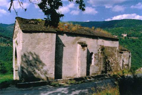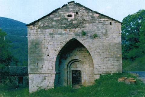 Du clocher-porche d’origine, qui se dressait encore au XVIIe s., il ne reste plus que la partie inférieure, dont l’importance évoque la monumentalité. Le porche en berceau brisé abrite, en retrait, un portail dont la double archivolte en plein cintre faite de larges claveaux repose sur des piliers carrés de même structure. Malgré d’épais contreforts qui soutiennent le bâtiment, les maçonneries présentent de nombreuses ruptures, dues aux glissements de terrains, à la construction d’une route et au manque d’entretien qui ont peu à peu conduit à des désordres important s. Un lavabo à l’arc trilobé est un témoin malheureux de ces dégradations, les fissures du mur ayant entraîné l’affaissement de l’un de ses jambages.