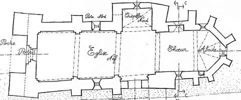 Son plan d’origine, en forme de croix latine, comportait une nef rectangulaire de trois travées, un faux transept dont il ne reste que le bras nord formant chapelle, un chœur à l’élévation moindre qui est formé d’ une travée et d’une abside à cinq pans éclairée par trois fenêtres à double ébrasement. La nef était voûtée en berceau et confortée au niveau des travées par des doubleaux reposant sur des pilastres. Au milieu du désordre important des maçonneries, subsiste une moulure qui court autour de la nef à la base de la voûte. Les arcades ouvrant sur les bras du transept sont en arc brisé, de même que l’arc triomphal qui retombe sur des colonnettes supportées par un cul-de-lampe. La chapelle nord est voûtée en arêtes.