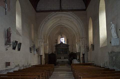 Dans le prolongement de la nef, le chœur, plus bas et voûté, est composé d’une travée droite et d’une abside semi-circulaire. Les colonnes et colonnettes engagées sont surmontées de chapiteaux bien caractéristiques de cette période de transition entre le roman et le gothique : feuilles lisses, rinceaux rythmés par des nœuds et des grappes de fruits, décors de trous de trépan, animaux ailés à tête de femme. Les voûtes sur croisée d’ogives sont constituées de trois boudins, rayonnant dans l’abside autour d’une clé en forme de fleur à quatre pétales.
