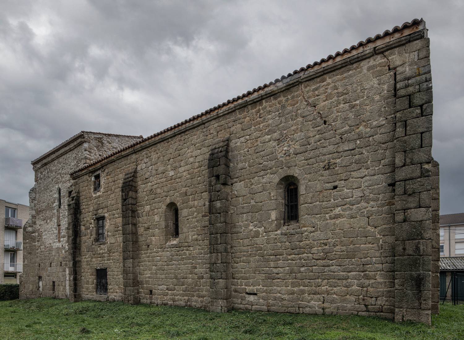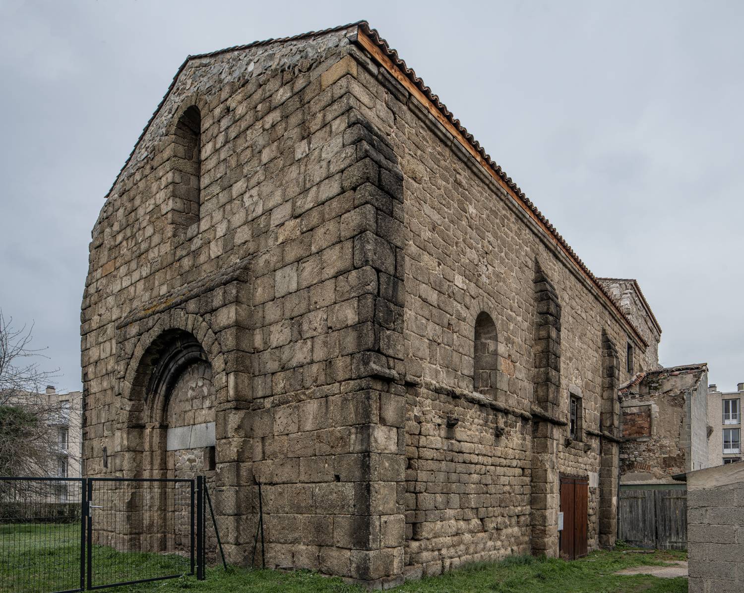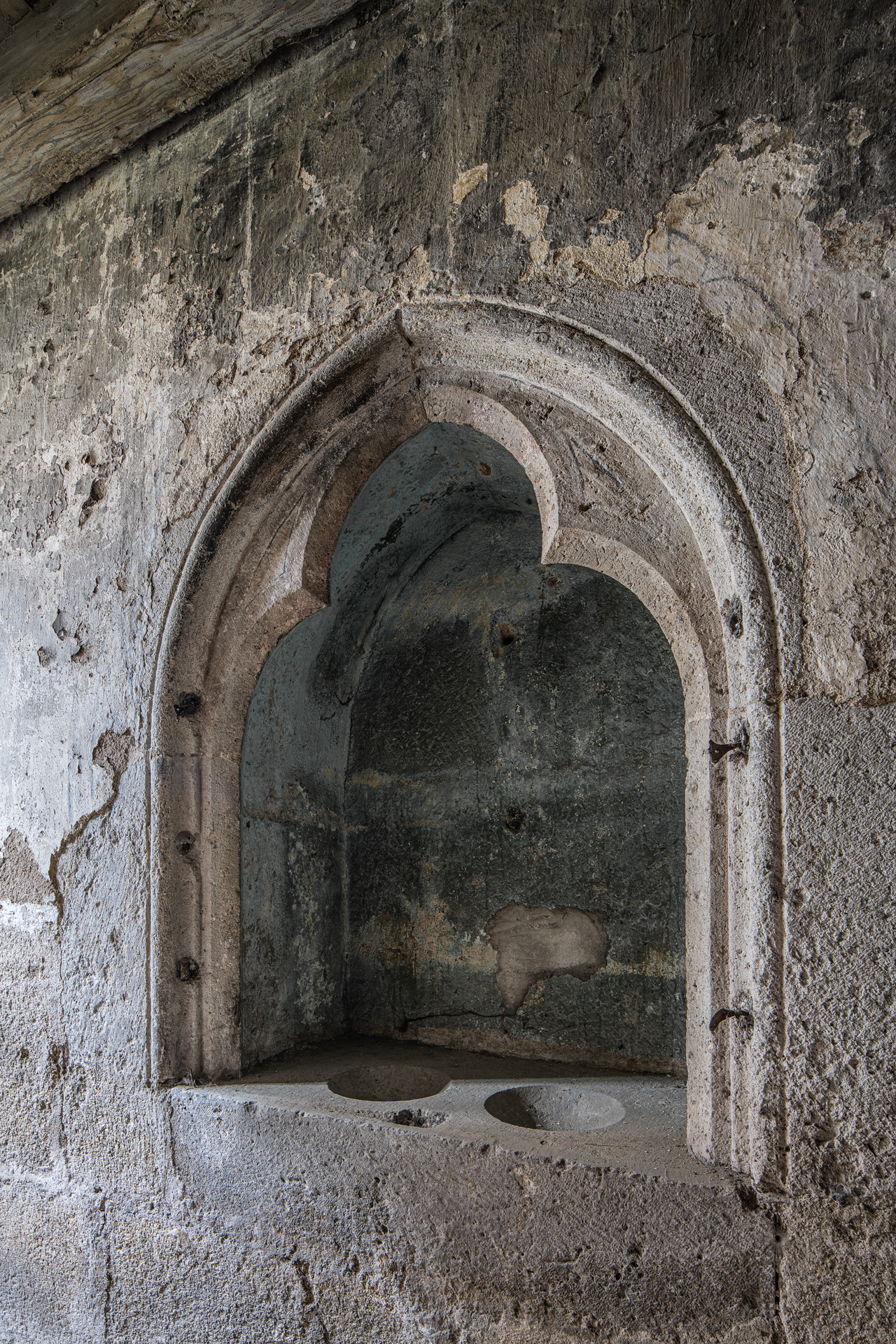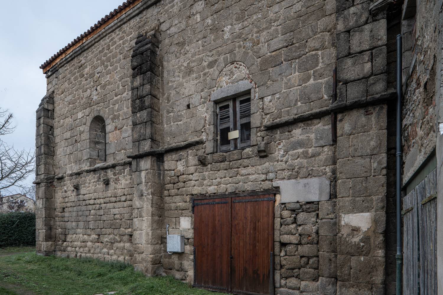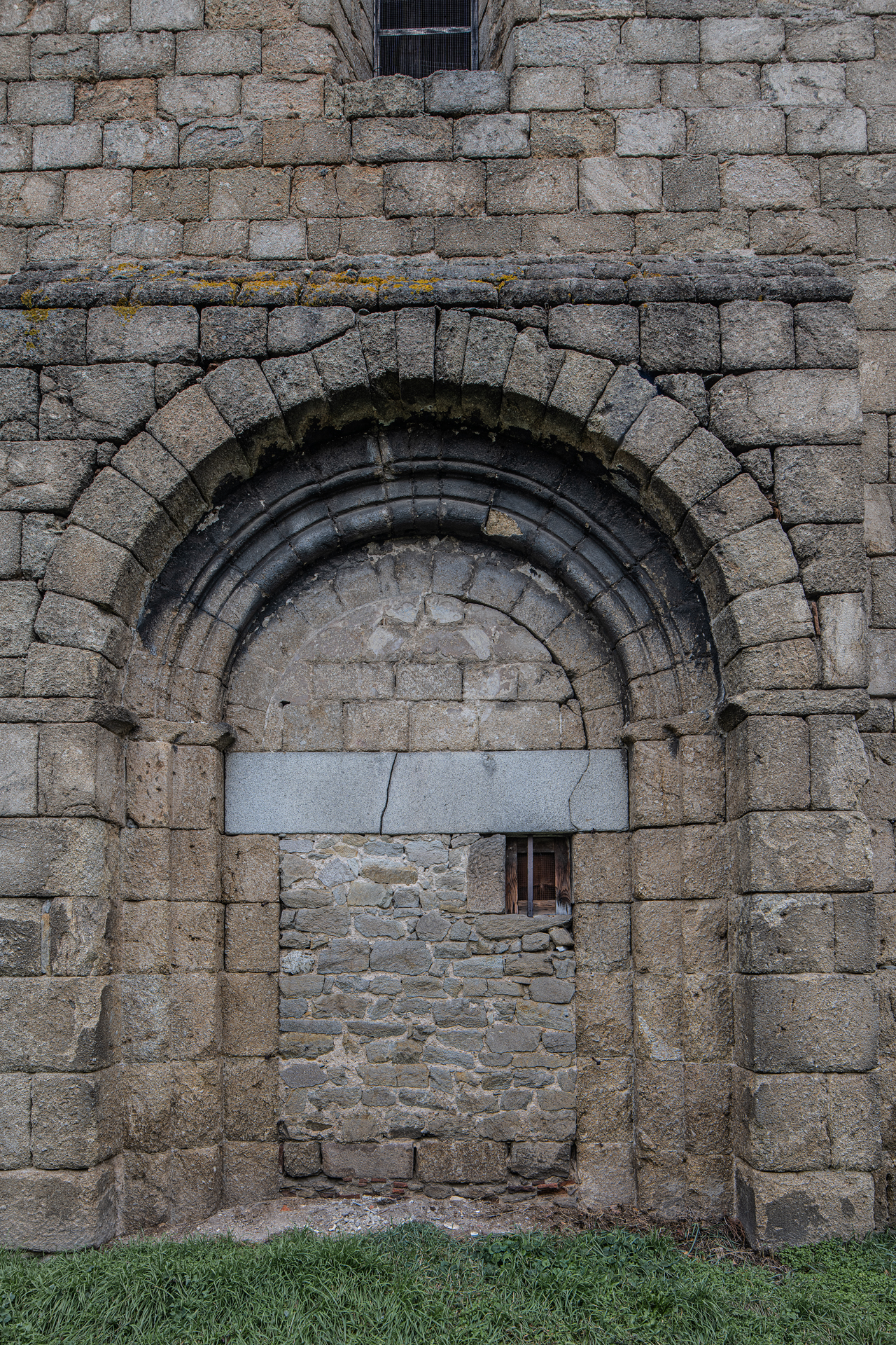 Les murs de chaque travée sont allégés par un arc légèrement brisé, où s’inscrit en partie haute une baie cintrée et fortement ébrasée.