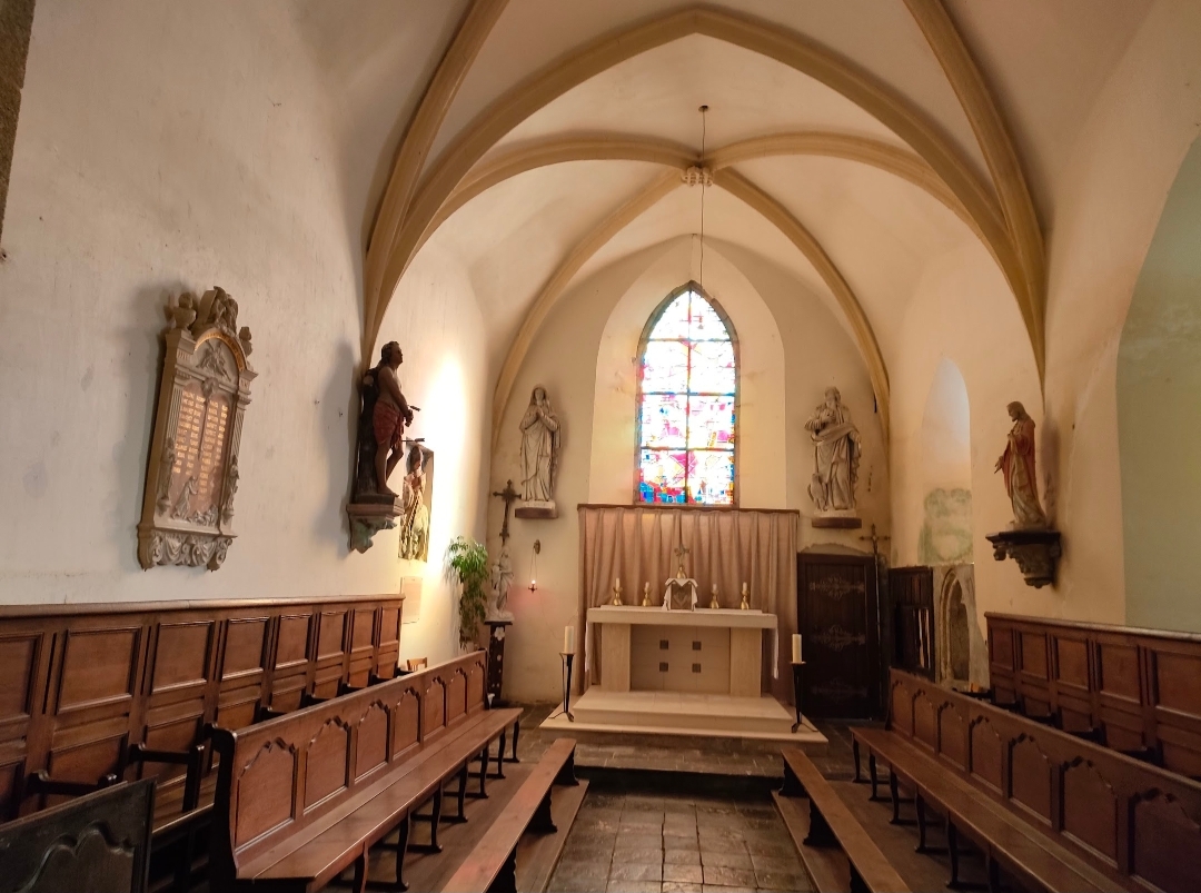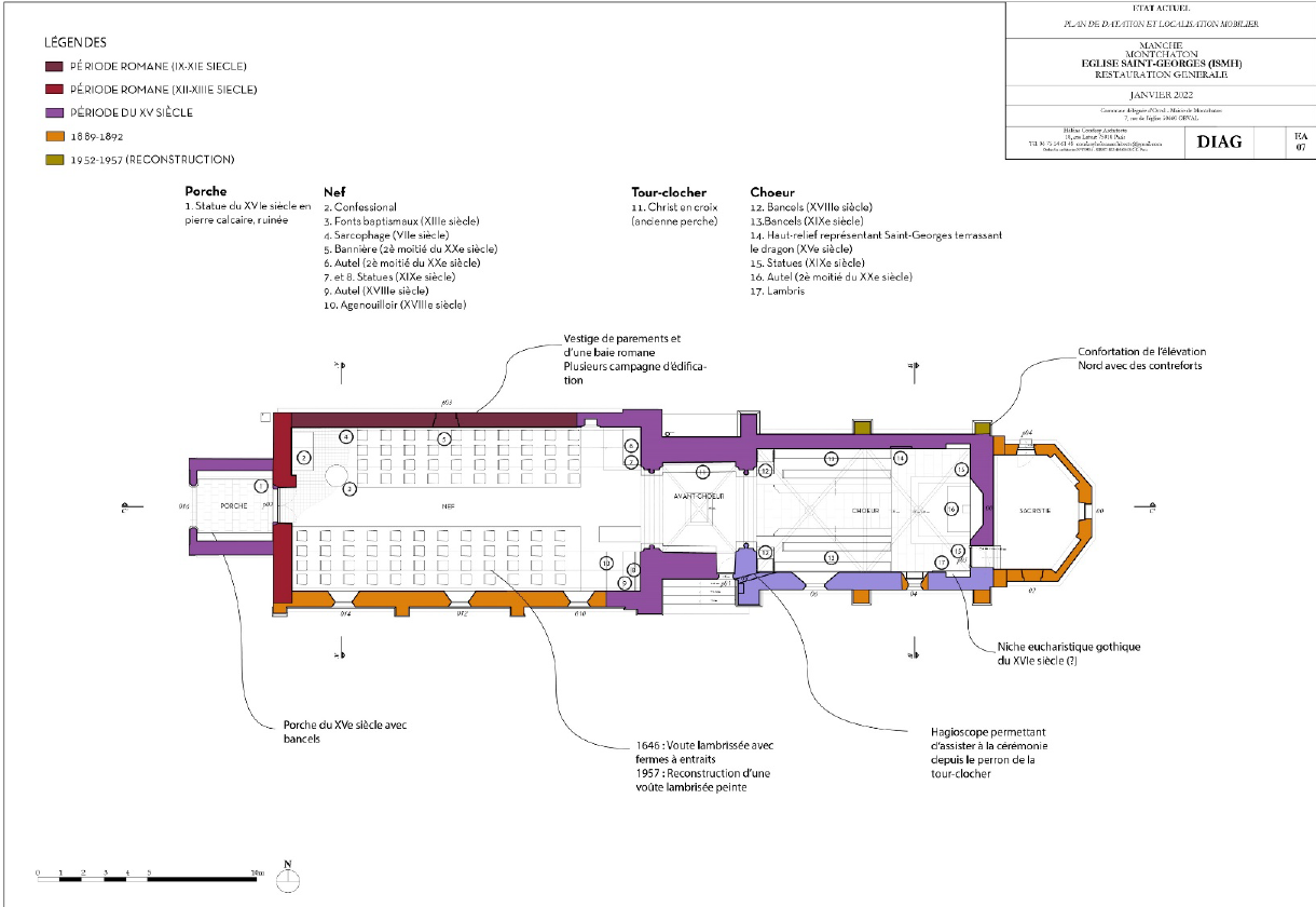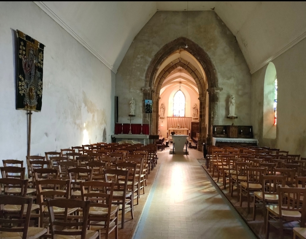 L’église Saint-Georges de Montchaton se compose d’une nef romane aux maçonneries anciennes, notamment visibles sur le mur nord en petits moellons grossièrement équarris. Dans le prolongement de cette nef ont été ajoutés, à partir du XVe siècle, un porche, un chœur à chevet plat et une puissante tour-clocher de plan carré, construite en granit de Chausey et renforcée par de solides contreforts d’angle. Cette tour, accessible par un unique accès surélevé, conserve des dispositifs défensifs remarquables, dont un ancien système de fermeture et un hagioscope ouvrant sur le chœur. L’édifice est complété par une sacristie édifiée à la fin du XIXᵉ siècle et s’inscrit dans un enclos paroissial dominant la vallée de la Sienne, au cœur d’un paysage de prés-salés.