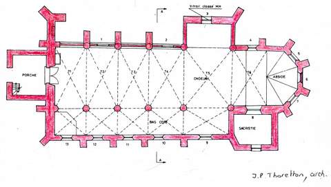 L’ensemble de l’édifice est construit en moellons recouverts d’un enduit très dégradé, seuls les encadrements de fenêtres sont en pierre. La couverture est en tuiles plates. Une simple corniche à modillons court sous la couverture. L’éclairage tombe de fenêtres en arc brisé sans remplage. Les cinq grandes baies du chœur présentent le même type de moulurations que celles de la nef, elles sont caractéristiques de la fin du Moyen Âge. Ces baies ont perdu leurs réseaux de pierre, peut-être lors de la mise en place de la vitrerie moderne. À l’intérieur, les cinq travées de la nef sont voûtées d’ogives qui retombent, par pénétration, sur de grosses piles rondes. Les voûtes du collatéral sud, à clés pendantes, reposent sur des grosses piles et des culots. Au nord, des chapiteaux carrés, sans abaque ni tailloir, reçoivent les nervures; celles du chœur pénètrent directement dans les murs.