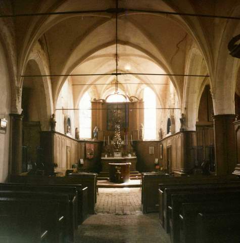 Église Saint-Loup , implantée au centre de la place du bourg, a été reconstruite à la fin du XVe s. ou dans les premières années du XVIe siècle. Cette église halle se composait à l’origine d’une nef à collatéraux, précédée d’un petit porche, et d’ un chœur constitué d’une travée barlongue et d’une abside à pans coupés. Au nord, une chapelle de plan carré s’ouvre largement sur la travée du chœur. Au sud, une sacristie est venue masquer partiellement la fenêtre du chœur. Un clocher, à structure en bois de plan carré surmonté d’une flèche octogonale, domine la deuxième travée de la nef. C’est à l’occasion de la restauration de son beffroi, en 1872, que la flèche a été recouverte d’ardoises. À la suite de graves désordres survenus dans les maçonneries du bas-côté nord, conséquences d’une modification mal conçue de la charpente de la nef au XVIIIe s., ce bas-côté a dû être démoli en 1924, la partie correspondante de ce collatéral dans le mur-pignon occidental ayant été alors conservée. Les grandes arcades de communication avec la nef ont été bouchées et des contreforts construits pour l’épauler.