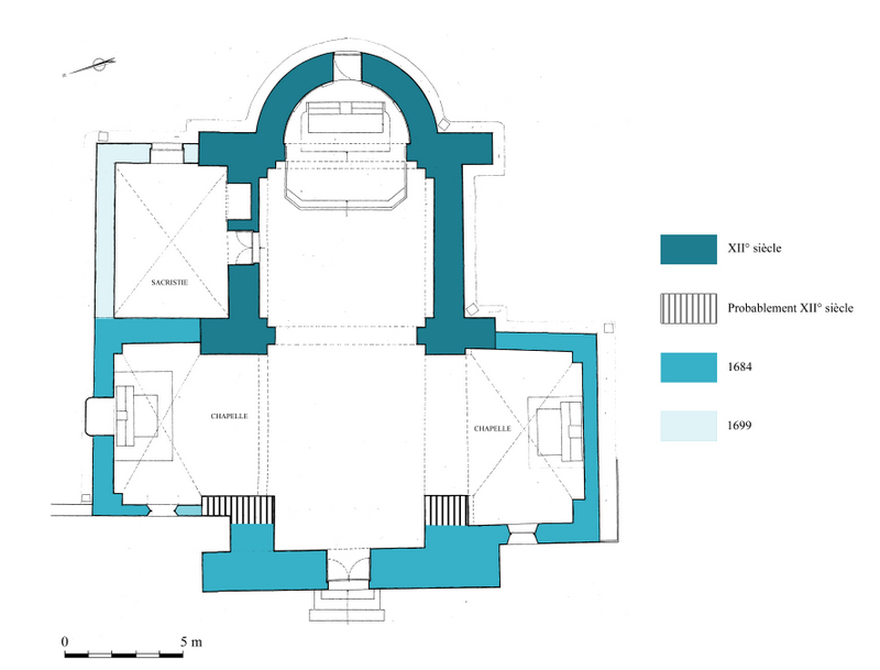 En 1684, d’importants travaux de restauration sont entrepris : réfection de la façade Ouest, réparation de la voûte et des couvertures, construction des deux chapelles latérales.