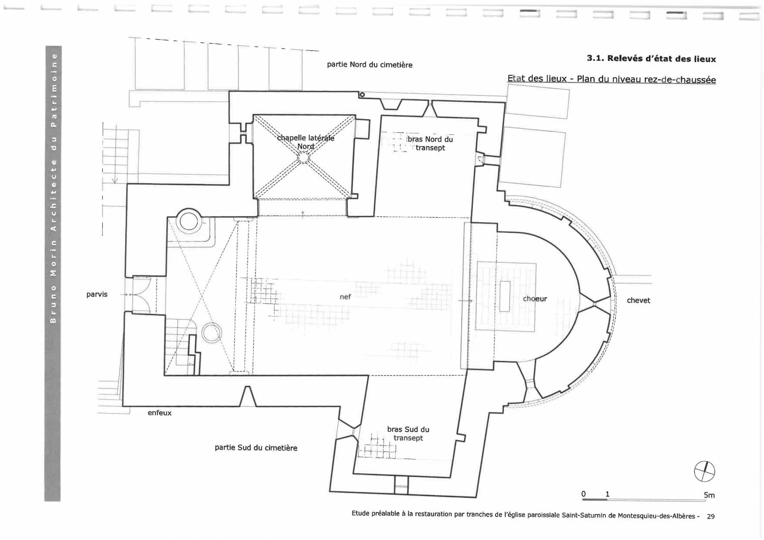 Deux chapelles forment un faux transept et une troisième chapelle bâtie le long de la seconde travée nord de la nef, est décorée dans le style gotique avec voûtes d’ogives. Le couvrement de la nef et des chapelles latérales étant, lui, en voûte en pierre de profil brisé. La première travée de la nef est surmontée d’une massive tour-clocher. Les murs sont en moellons enduits et les couvertures en tuiles creuses.