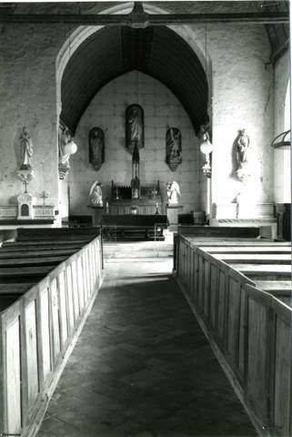À l’intérieur, la modestie de l’édifice blanchi à la chaux est compensée par le haut volume de la charpente lambrissée qui couvre la nef, à poinçons et entraits moulurés.