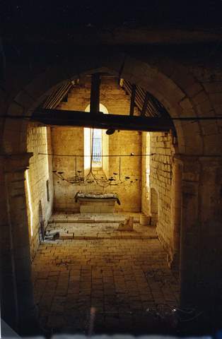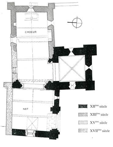 L’accès à l’église se fait au sud dans la première travée de la nef par un portail roman en plein cintre à trois rangées de tores retombant sur des colonnettes à simples chanfreins. La date de 1644 qui apparaît sur la clé d’arc témoigne d’une réparation. L’église se compose d’une nef, d’une travée de plan carré sur laquelle ouvre la chapelle sud, et d’un chœur à chevet plat dont le niveau surplombe, en raison de la déclivité du terrain, le sol extérieur d’environ 3 m. Dans la partie inférieure du mur du chevet un puits a été aménagé. Les ouvertures, peu nombreuses, sont hautes et étroites. La fenêtre d’axe en arc tréflé révèle une intervention du XIIIème s. ; une fenêtre XVème s. a été percée dans le mur nord du chœur ; elle est vraisemblablement contemporaine de la reprise de ce mur à la même époque. A l’intérieur, seule est voûtée la chapelle sud, sur croisées d’ogives. Ces dernières retombent sur des colonnettes à chapiteau dont la partie inférieure est tronquée ou amortie en masques humains. L’arc diaphragme au profil brisé retombe sur des colonnes engagées puissantes et soigneusement appareillées ; elles cantonnent trois des quatre angles de la travée de plan carré. Les amorces des nervures ne permettent pas d’affirmer que cette partie de l’édifice reçut effectivement un voûtement. Le chœur et la chapelle sud ont tous deux conservé leur autel de pierre, reposant sur un socle de maçonnerie.