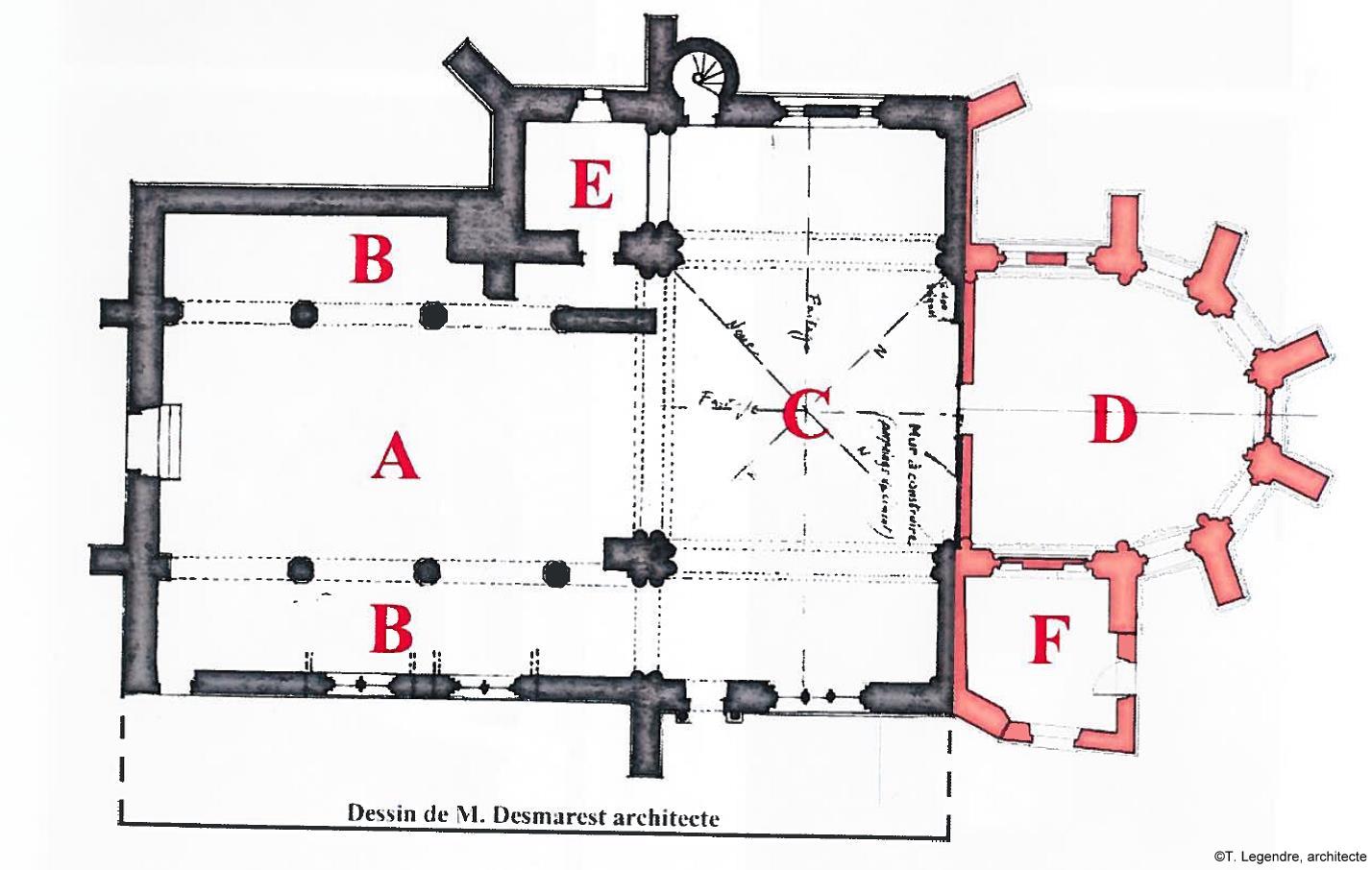 L’église est constituée d’une nef romane, modifiée au XVe siècle et comportant de grandes arcades ouvrantes sur des bas-côtés, d’un vaisseau transversal à transepts débordants, d’un choeur d’une travée amorti sur un chevet polygonal, d’un clocher à angle Nord-Ouest et d’une petite sacristie rapportée à l’angle Sud-Est.