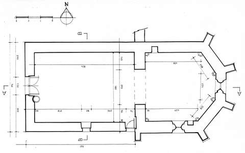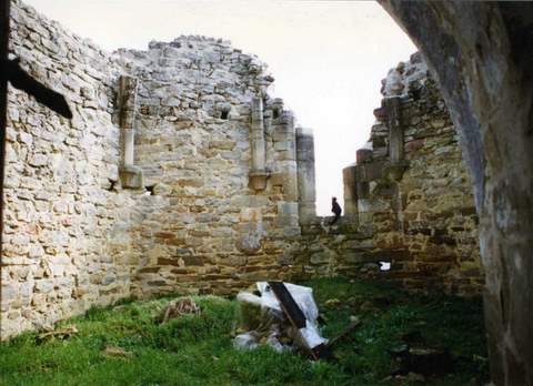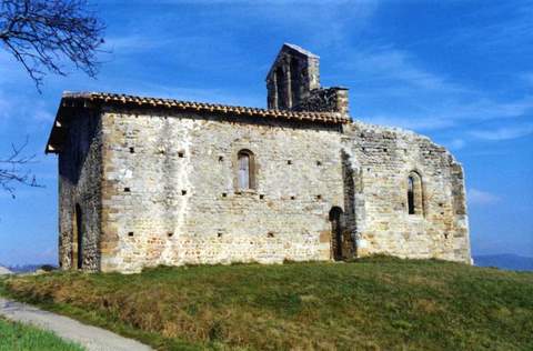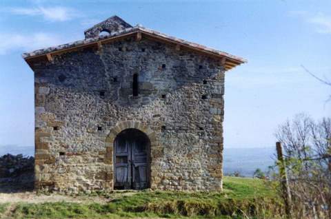 L’édifice, admirablement situé, se compose d’une nef unique, reconstruite, à l’exception de la façade ouest, au XVIIe siècle. Un mur pignon, supportant un clocher-arcade dont les cloches ont disparu, sépare la nef du chœur dont la travée droite se termine par une abside à trois pans. La voûte, attestée par les retombées d’ogives sur des culots, s’est effondrée à une époque assez récente. L’ensemble ne paraît pas antérieur au XIIIème s., peutêtre même avec des reprises plus tardives. Dans le mur sud, le lavabo est surmonté d’une arcade tréflée. Au revers de la façade occidentale est scellé un beau bénitier de pierre. Les murs de la nef montrent des traces de peintures dont une litre funéraire.