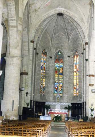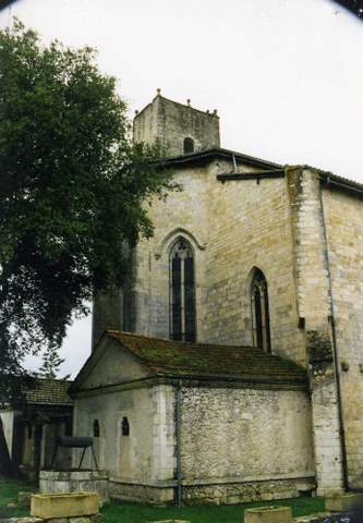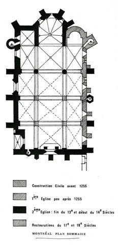 COLLÉGIA LE Saint-Philippe-et-Saint-Jacques. Montréal, qui se situe aux limites de l’Agenais et de la Guyenne, était rattachée sous l’Ancien Régime à l’évêché de Condom. La ville compte au nombre des bastides construites à partir de 1250 par Alphonse de Poitiers, quand, après la mort de son beau-père Raymond VII en 1249, il hérita du comté de Toulouse. La première église alors édifiée était dédiée à la Vierge ; son emplacement correspondait au bas-côté sud de l’église actuelle. Elle-même avait réutilisé les murs d’une maison à deux étages du XIIe ou du XIIIe s., parfois appelée château, dont la partie occidentale était située dans le prolongement des remparts, comme en témoigne encore le mur sud de l’édifice, percé d’étroites meurtrières.