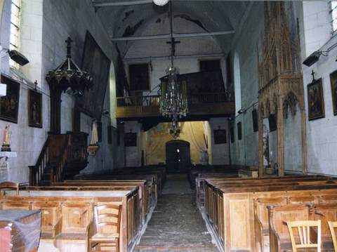 Le chœur a, par contre, conservé une belle voûte de pierre à six voûtains, dont les nervures se rejoignent à la clé autour d’un médaillon sculpté de la figure d’un Dieu le Père, pièce rapportée en 1882, comme l’indique une inscription au revers. Elles retombent aux angles des pans sur des culs-de-lampe en forme de têtes. L’arc doubleau de l’entrée repose, par l’intermédiaire de tailloirs épais, sur des colonnettes aux chapiteaux à crochets. Ces détails suggèrent pour la nef et le chœur la fin du XIIIe siècle ; les fenêtres en lancettes sous un arc brisé ne démentent pas cette datation.