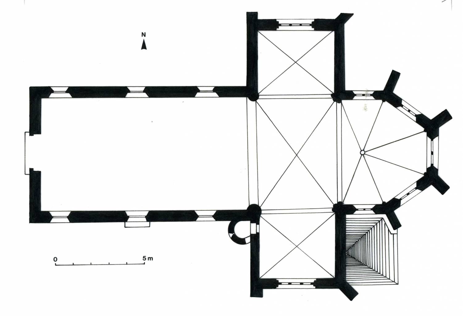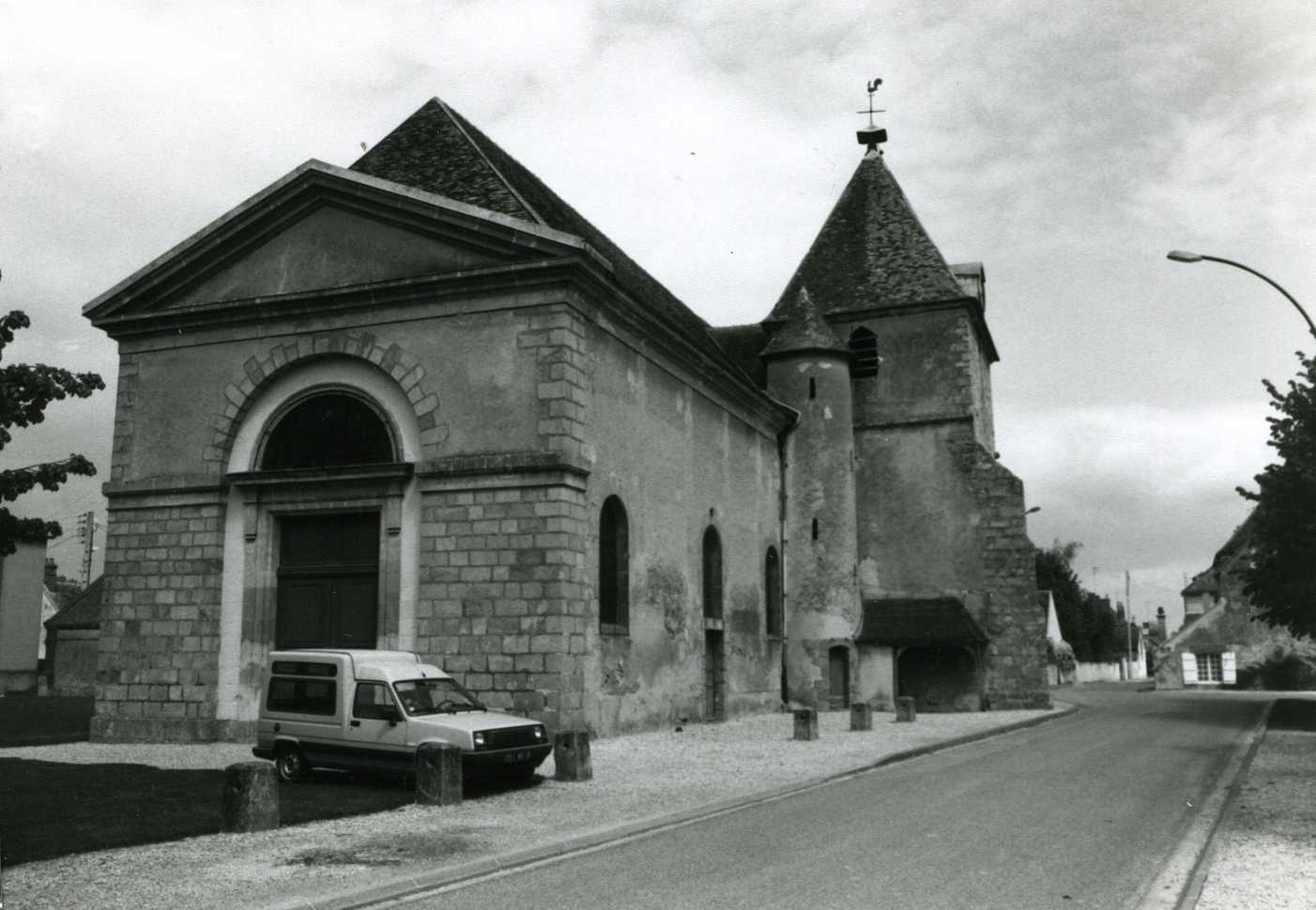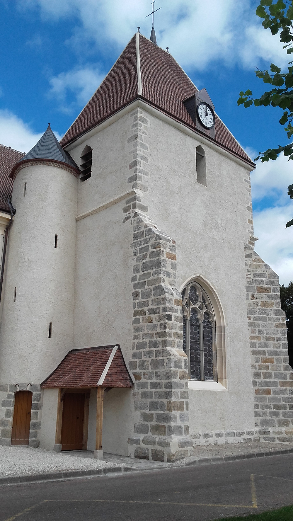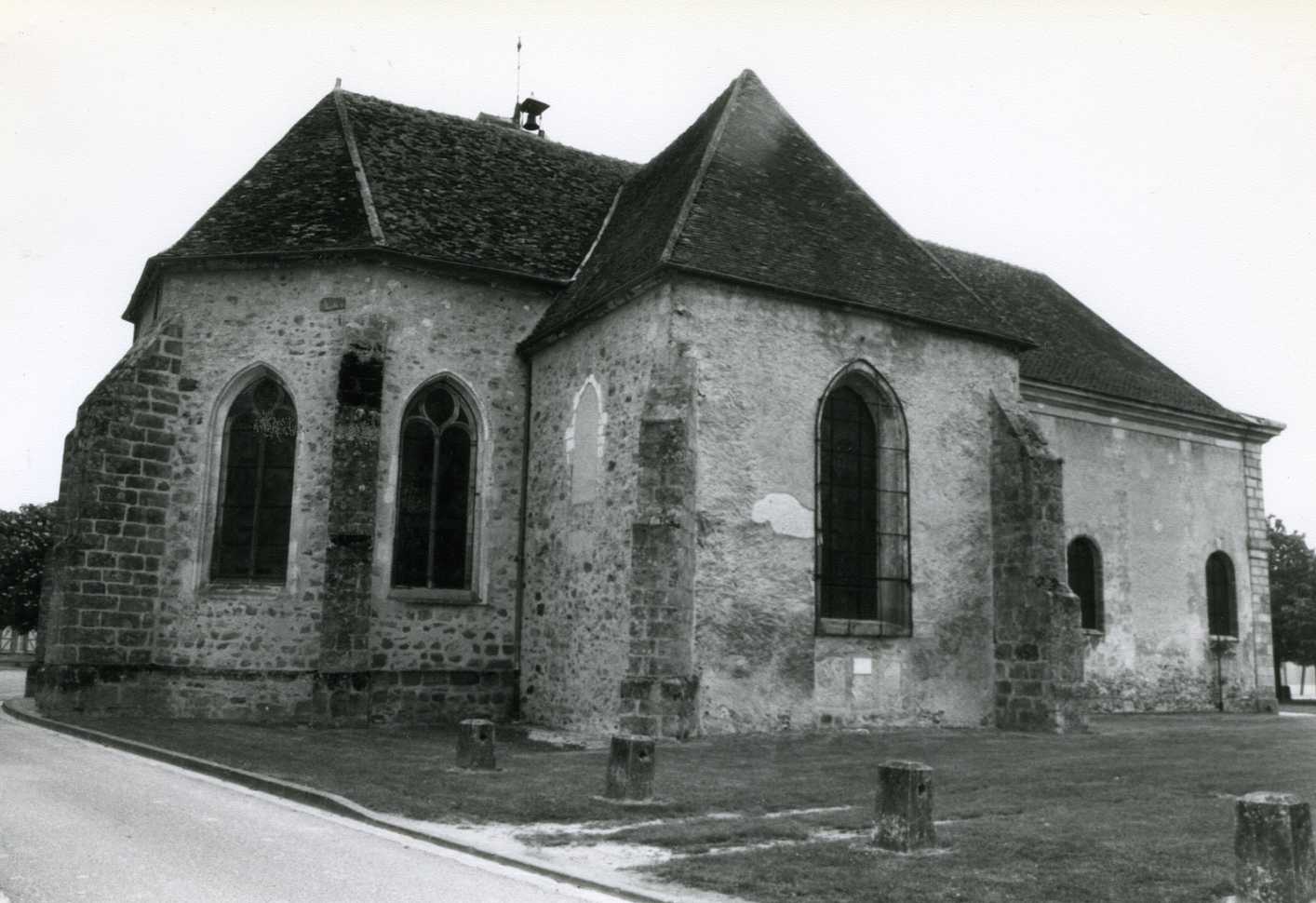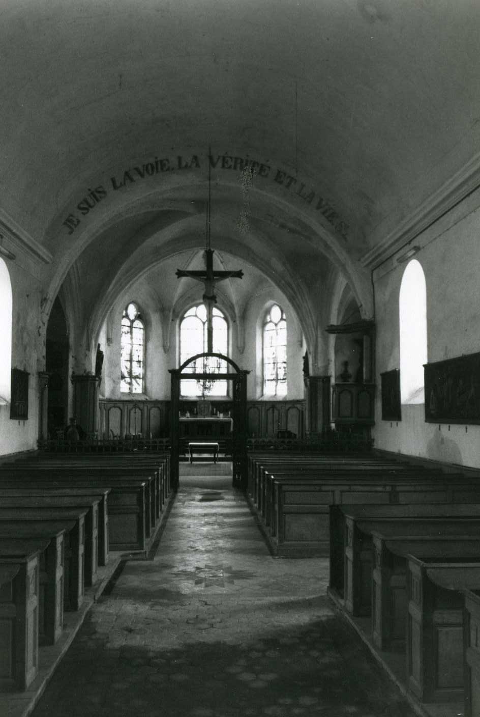 Bâtie sur un plan en croix latine, l’église, d’une longueur approximative de 22 mètres, comporte une nef et un transept sans collatéral. Le chœur est inclus dans le vaste polygone que constitue le chevet. Les parties les plus anciennes, le chœur et le transept, semblent remonter au premier tiers du XVIème siècle. Elles sont recouvertes de voûtes d’ogives, de profil prismatique, qui naissent sur des culs-de-lampe décorés de feuillages, de masques, de têtes d’angelots et d’autres motifs variés. Dans le chœur, la clef pendante est joliment travaillée. Les fenêtres du chœur et du croisillon Nord sont très simples, refendues par un seul meneau qui reçoit deux arcs en plein cintre. En revanche, la fenêtre du croisillon Sud comporte deux meneaux que surmonte un remplage de mouchettes et de soufflets. La nef a été probablement construite plus tard, durant le XVIIIème siècle, peut-être à l’occasion de la reconstruction du château. Le clocher, de plan carré et à un seul étage, s’élève au-dessus du croisillon Sud du transept.