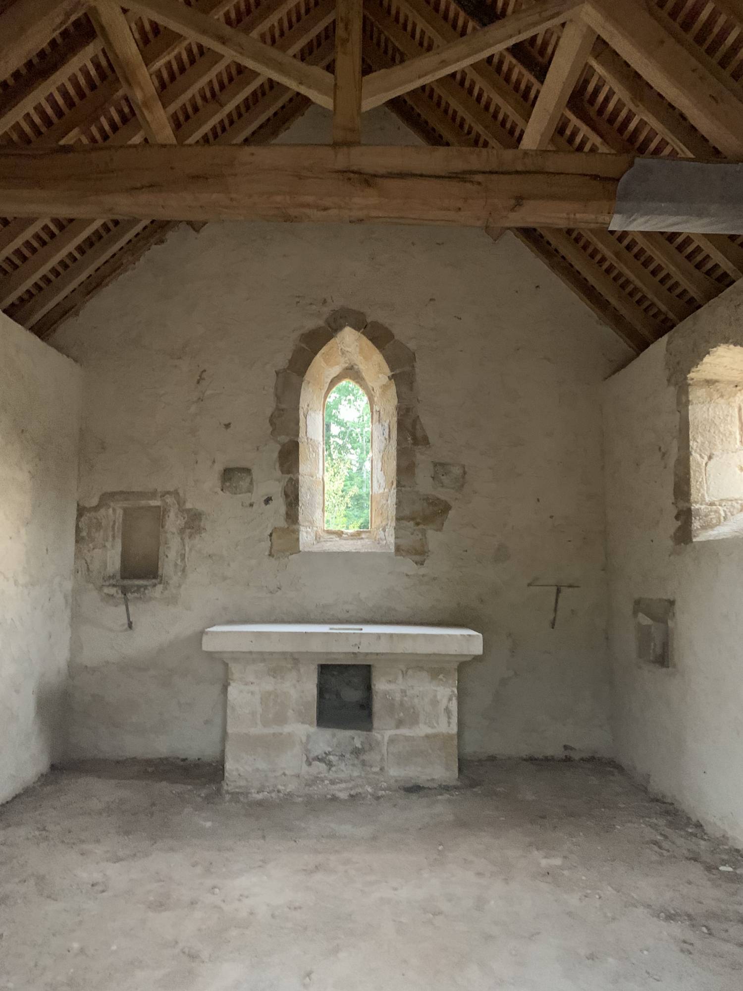 Les murs intérieurs de la chapelle sont blanchis à la chaux et le sol est pavé de carreaux de brique. Elle contient deux vieilles statues de bois : une sainte Marie-Madeleine et un saint Jean-Baptiste.