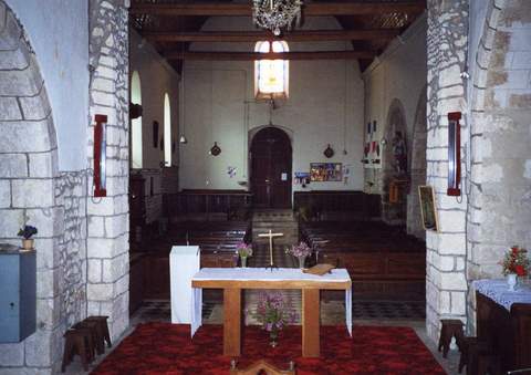 L’édifice, ruiné par la guerre de Cent Ans, n’a conservé de partie ancienne que la tour du clocher et la chapelle qui se trouve à sa base, et sans doute les murs gouttereaux de la nef du XVe siècle. Cette nef n’a jamais été voûtée mais couverte d’une charpente lambrissée. Sur le côté gauche, un collatéral a été aménagé au XIXe s. (1858) avec trois travées couvertes de fausses voûtes sur croisées d’ogives en brique et plâtre ; il communique avec la nef par trois arcades en plein cintre chanfreinées et retombant sur des piliers quadrangulaires.