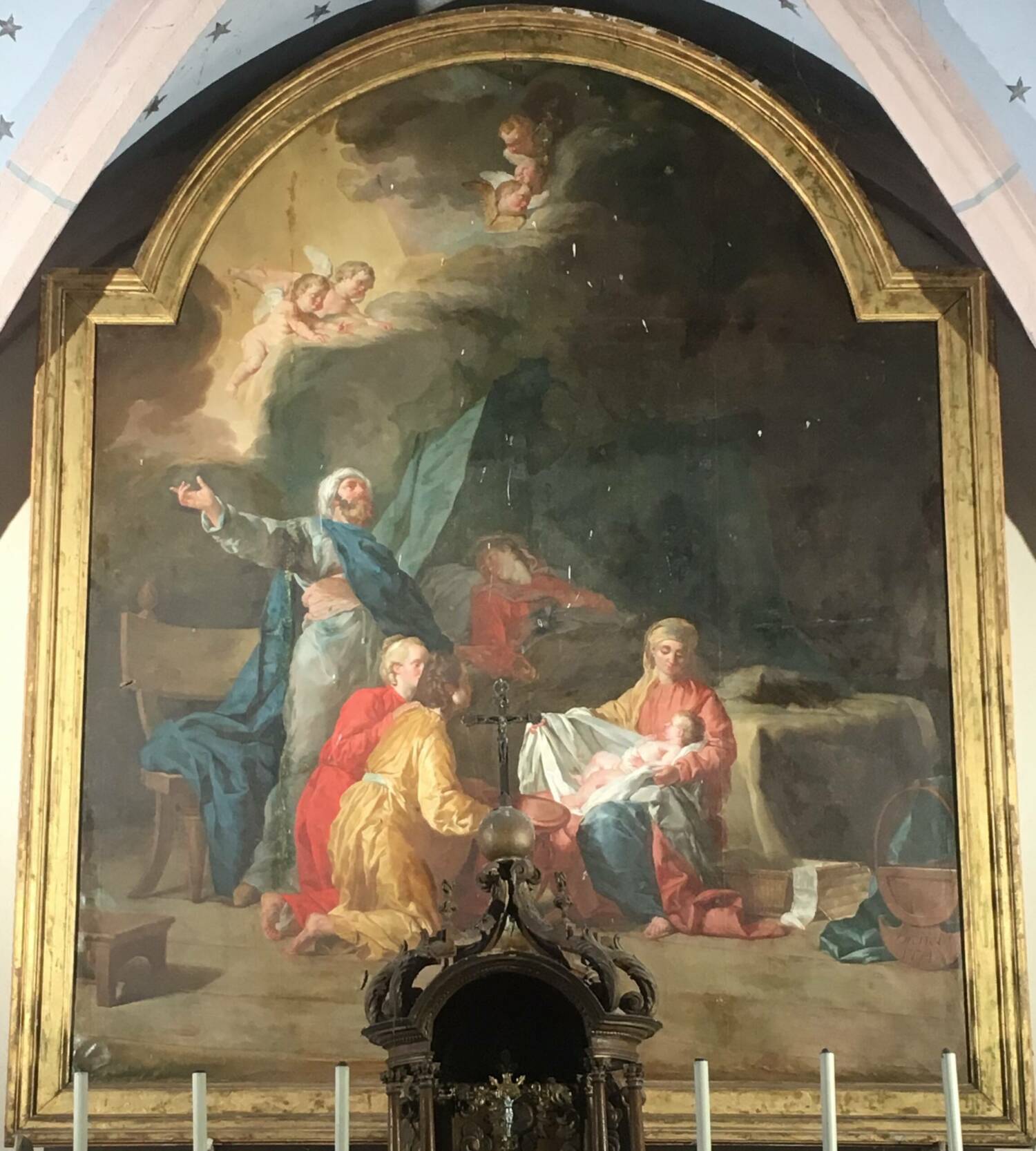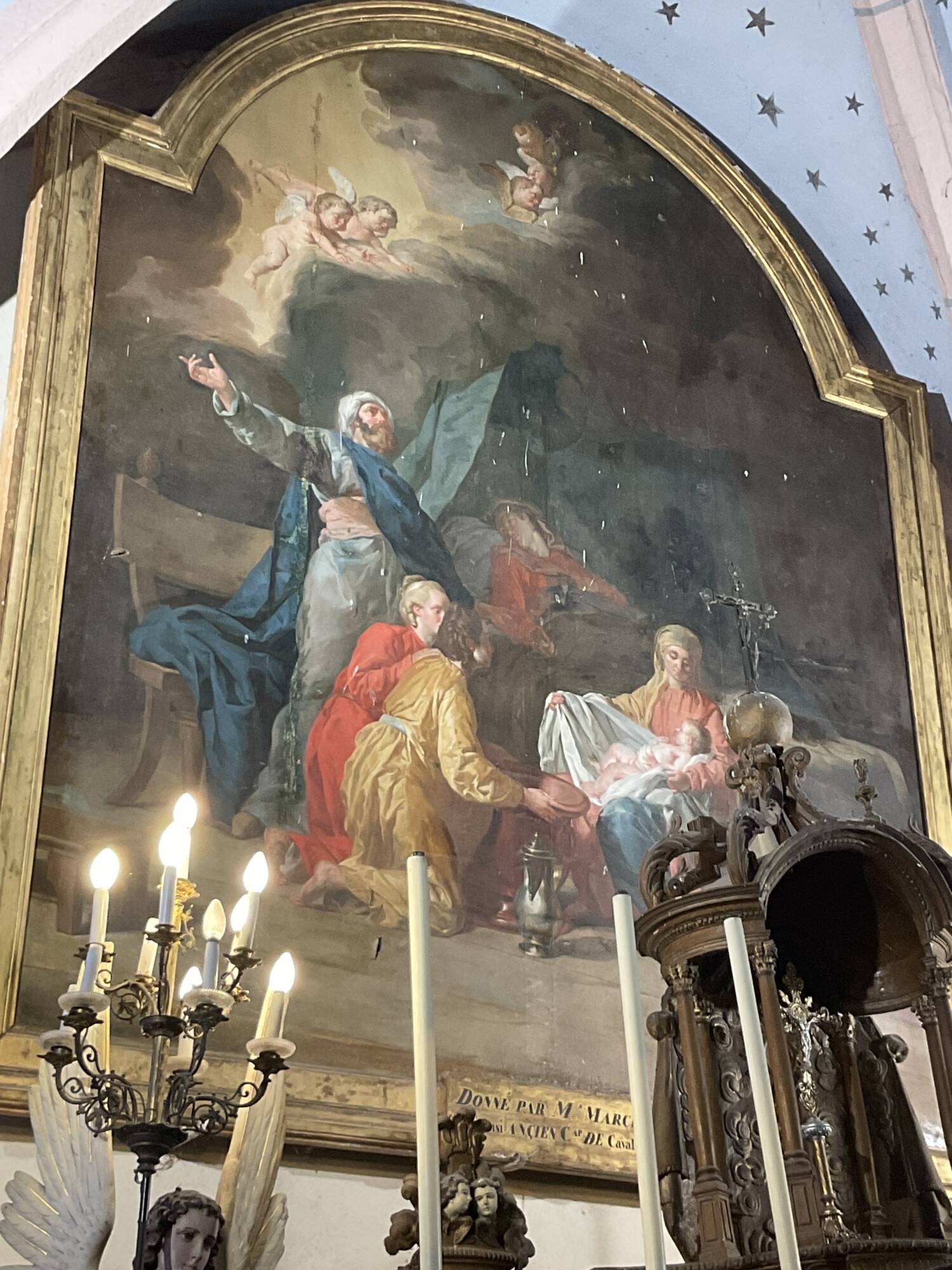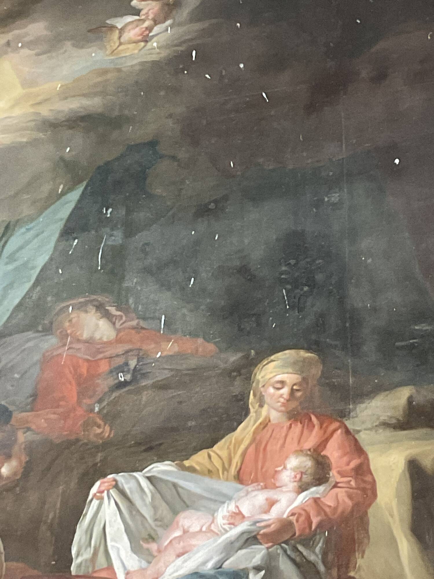 Commandée par un notable du bailliage de Bruyères, elle dépeint avec noblesse et tendresse une scène intime : Marie contemplant l’enfant, entourée de servantes aux gestes délicats, tandis que Joseph, en extase, élève les bras vers le ciel.