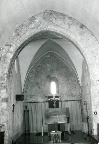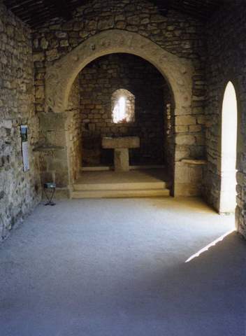 l’une au nord, l’autre au sud. Le chœur est à chevet plat. Son axe est légèrement déporté vers le sud par rapport à la nef. Un arc triomphal, disparu, retombait sur des impostes profilées encastrées dans le mur. Une de ces impostes a pu être mise au jour. Des vestiges d’un autel ont été également trouvés au centre du chœur. Cette église, aujourd’hui à ciel ouvert, devait être recouverte d’une charpente. Les murs étant actuellement arasés, il est difficile de situer les fenêtres qui devaient être au nombre de quatre. Quelques éléments retrouvés permettent de penser qu’elles étaient ébrasées à l’intérieur et surmontées d’un linteau échancré. En 1989, la Sauvegarde de l’Art Français a versé une somme de 20 000 F à l’association des Amis de Saint-Christol à fin de permettre, dans un premier temps, la restauration des murs de l’édifice.