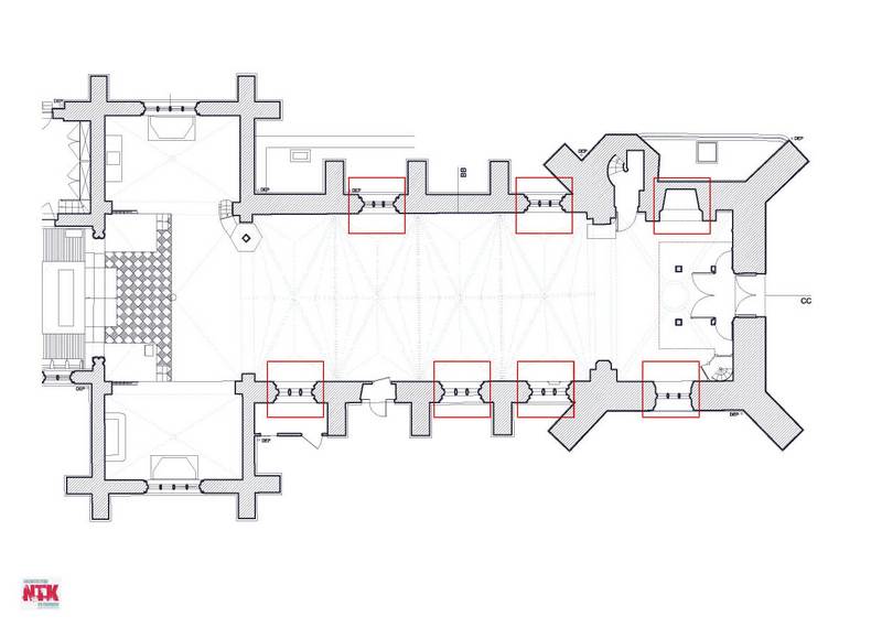 La nef et son volume ont été complètement modifiés par les travaux de la 2ème moitié du XVIe (vers 1550-70). La tour de croisée a été tronquée par la destruction des étages supérieurs en 1651 et transformée en porche-narthex avant la fin du XVIIe. Suite à cette destruction qui entraîna l’effondrement du chœur, le plan de l’édifice a été renversé et le chevet reconstruit à l’ouest, la tour de croisée devenant une tour-porche hors-œuvre.