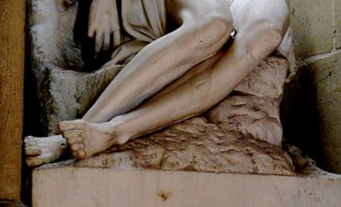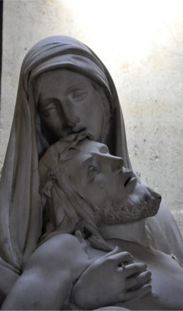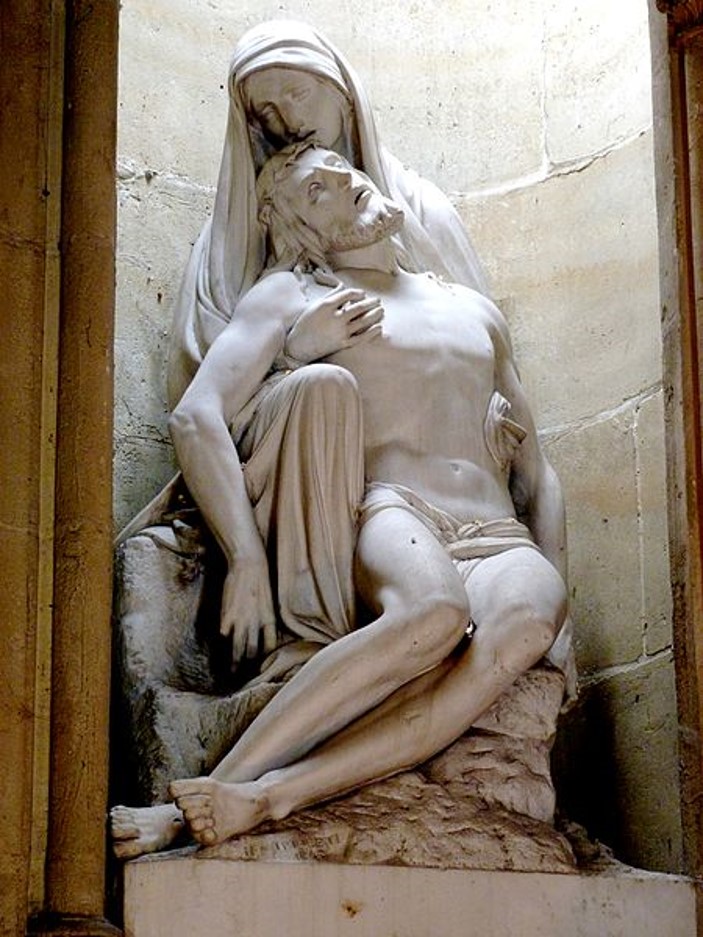 La Pietà est une sculpture en marbre d’1m20 réalisée par Henry de Triqueti. Cet artiste est connu pour ses multiples oeuvres religieuses d’un style nouveau combinant beaux-arts et arts décoratifs, mais il est également un très grand collectionneur d’estampes et de dessins. Joyaux de l’art romantique du XIXè siècle, elle surplombe le choeur de Notre-Dame-de-Compassion.