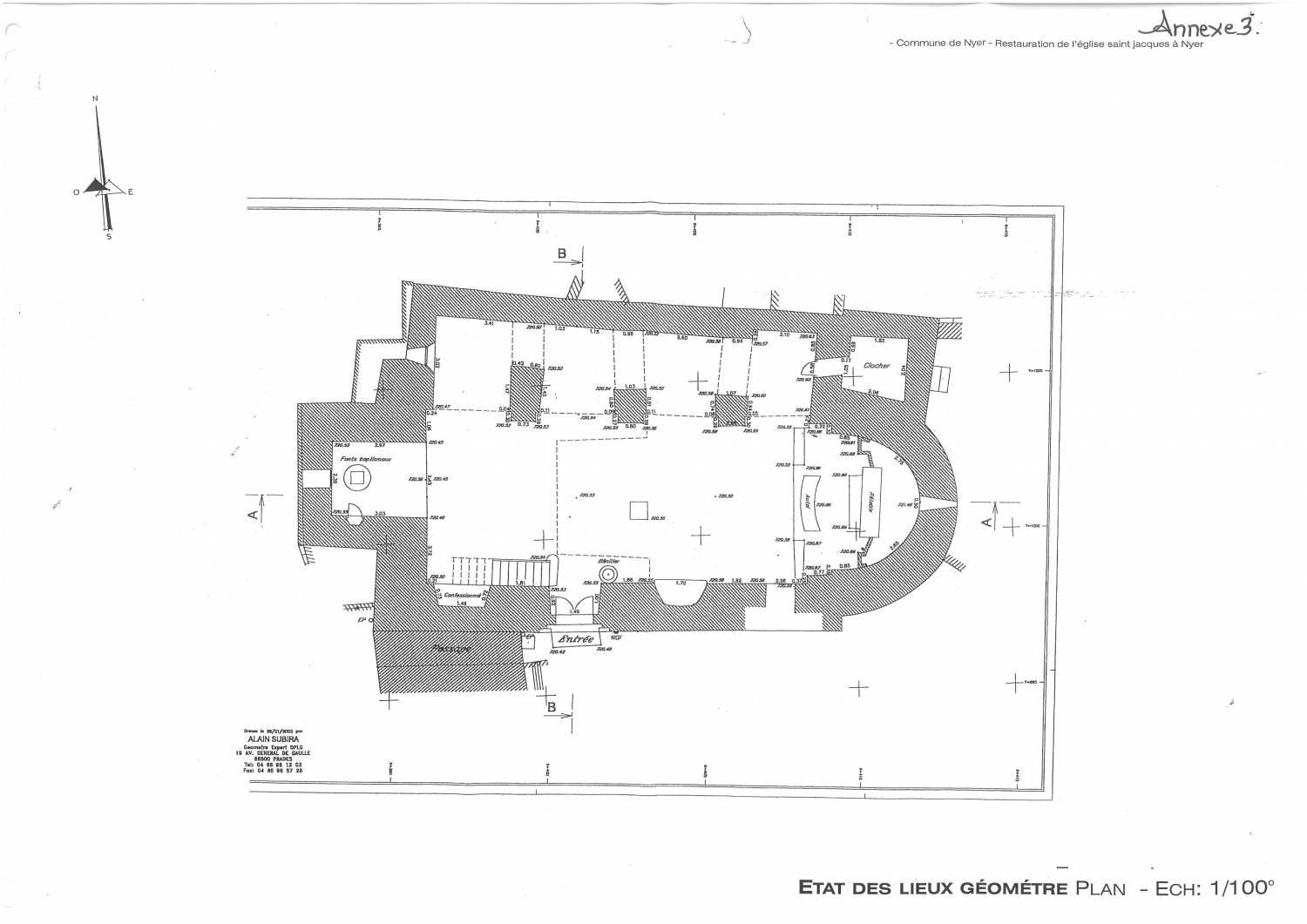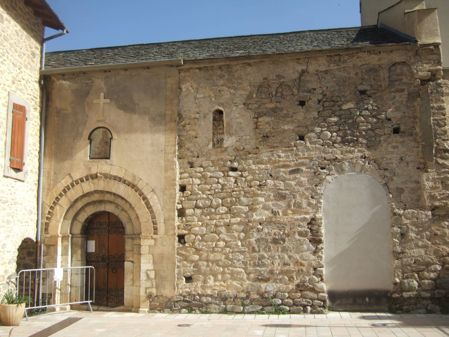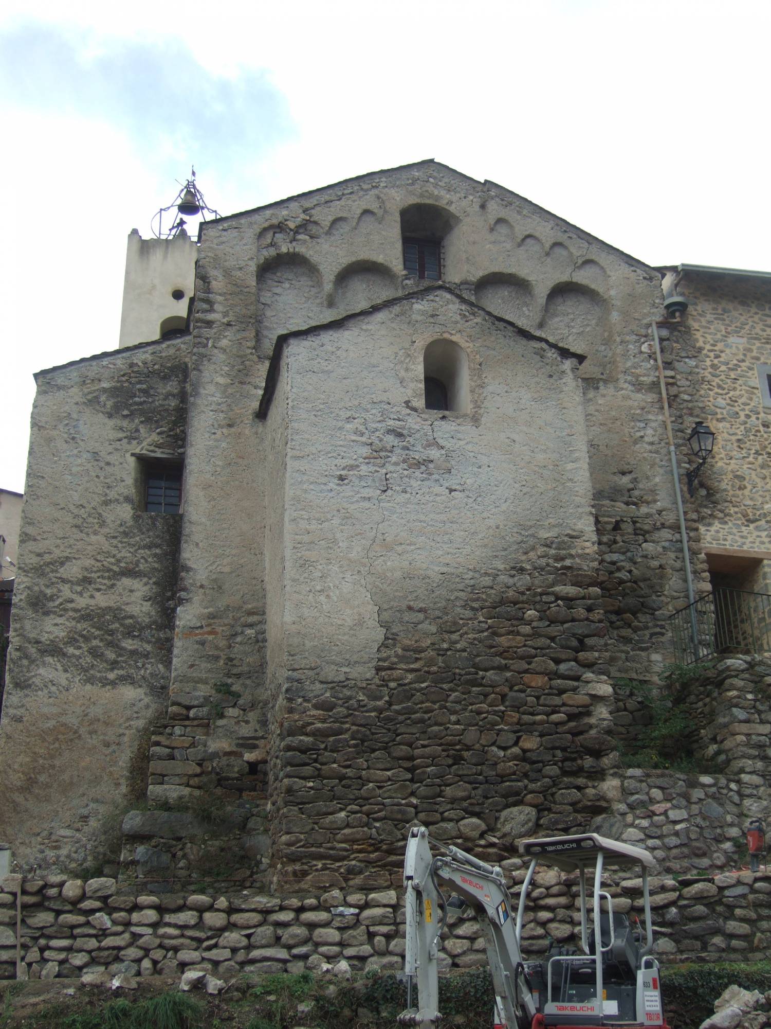 On accède à l’église par le portail situé au sud, encadré par trois rouleaux en plein cintre. L’archivolte s’orne d’une frise à dents d’engrenages. Au-dessus, une niche moderne abrite une statue d’une Vierge à l’Enfant assise, d’époque médiévale. Les vantaux, anciens, présentent trois séries de ferrures horizontales ramifiées en volutes spiralées, aux enroulements contrariés. Le gros oeuvre de la nef et de l’abside remonte au XIe siècle. La fenêtre latérale sud éclairant l’abside et le choeur est caractéristique des décors gothiques attardés du XVe siècle finissant. La sacristie qui était un appendice rajouté au XIXe siècle sur la façade de l’édifice roman fut démoli au début des années 2000 par la municipalité de Nyer lors de travaux du pourtour de l’église. L’édifice est appareillé en moellons de schiste et granit liés au mortier, et d’un chaînage d’angle en pierres de taille.