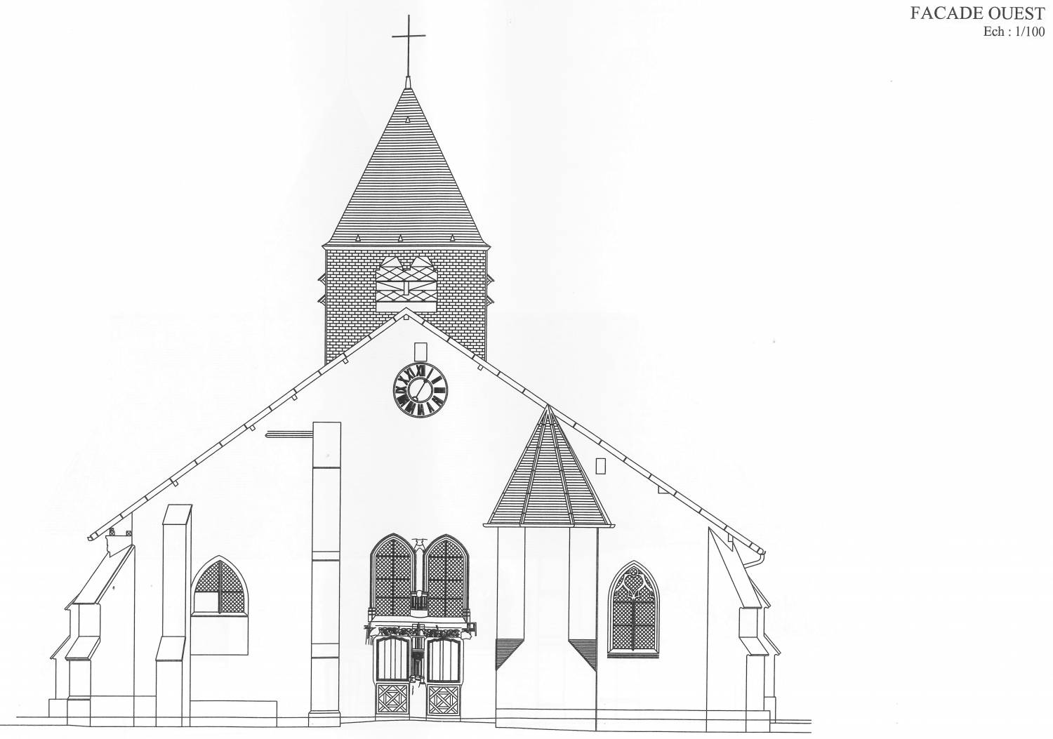 Une tourelle carrée, à droite du portail, prend, à trois ou quatre mètres, la forme octogonale, elle contient l’escalier des combles couvrant les trois nefs et qui furent rétablis après l’incendie.