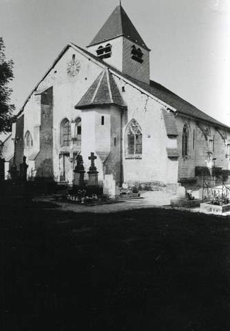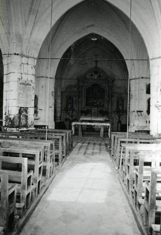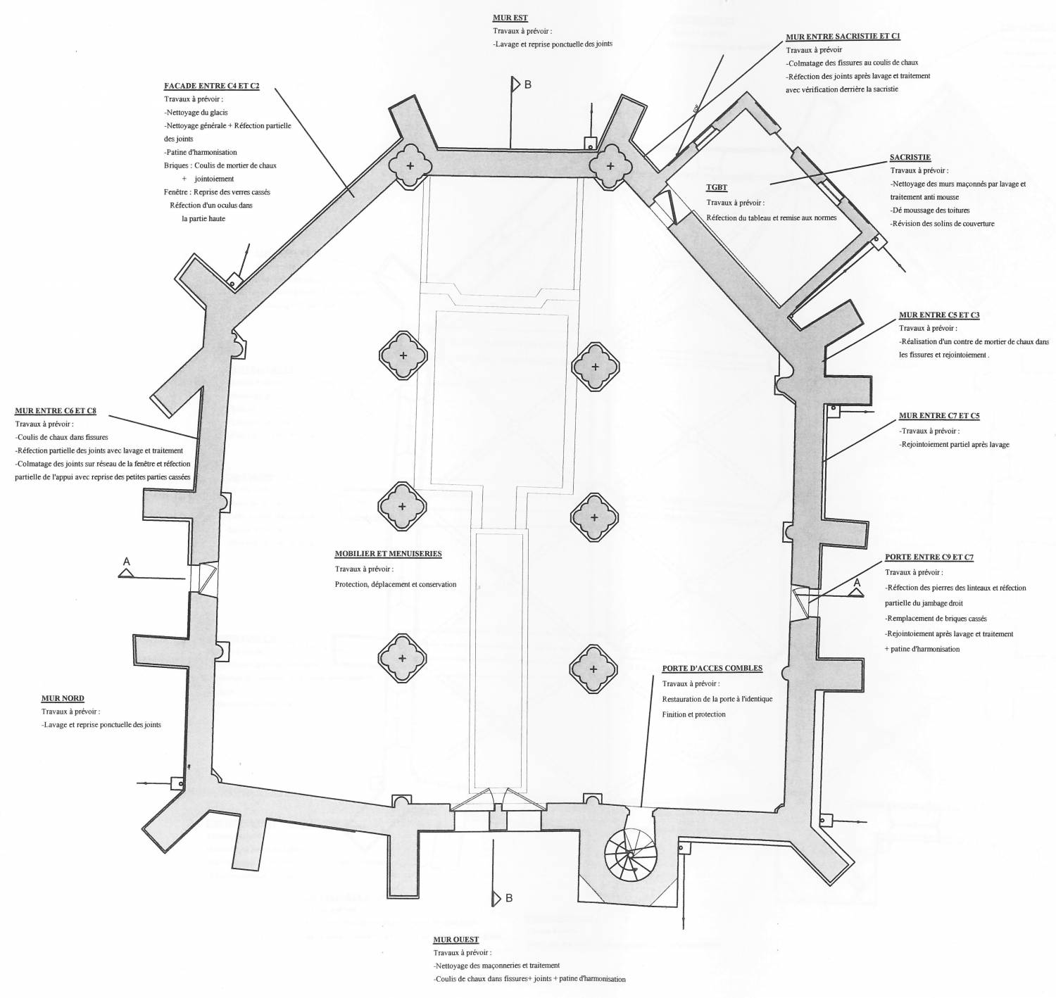 La toiture largement modifiée est aujourd’hui composée de deux versants avec croupe. Son plan est régulier avec nef et collatéraux.