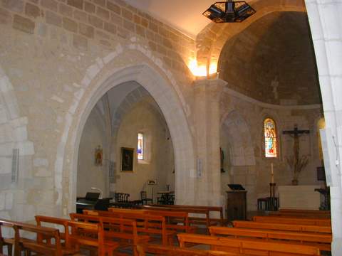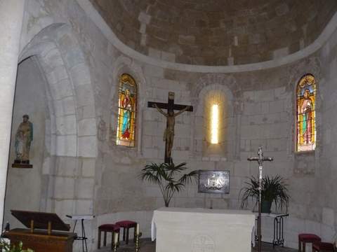 L’église, entourée du cimetière, se compose donc aujourd’hui d’une nef flanquée de deux bas-côtés. La partie orientale, travée droite de chœur et abside hémi-circulaire, n’a pas été modifiée à l’époque moderne. Le chevet est la partie la plus intéressante de l’édifice : le surcroît abritant la chambre haute se lit clairement au-dessus de la corniche, qui est ornée d’un rang de billettes et repose sur des modillons, sculptés de motifs géométriques et végétaux. Dans l’axe de l’abside s’ouvre une étroite fenêtre meurtrière tandis que les ouvertures, pratiquées dans les murs nord et sud, sont tardives.