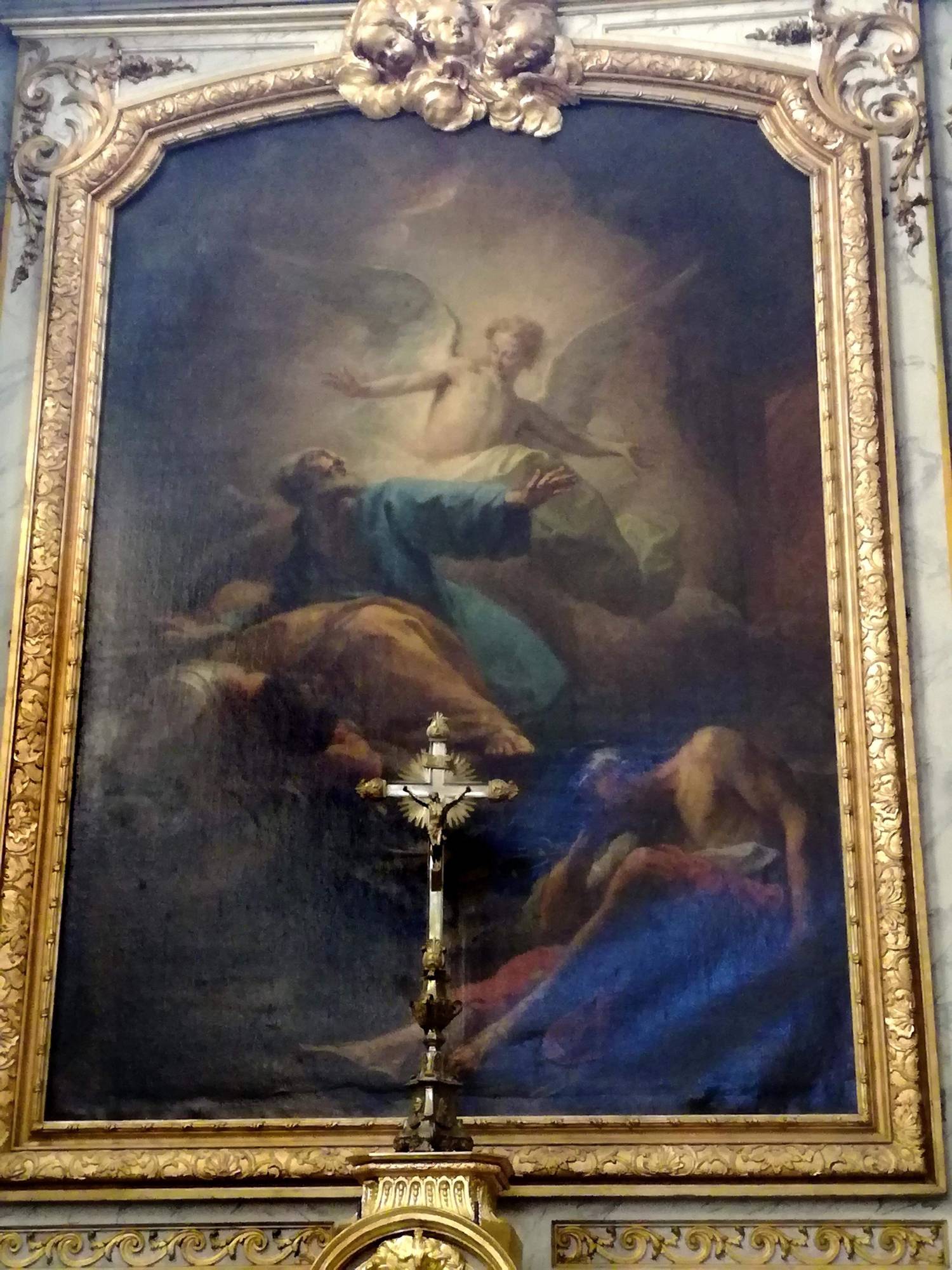 - Un vernis jauni homogène unifiait l’ensemble de la composition : il ternissait les couleurs vives qui étaient pourtant la marque du peintre Jean II Restout, atténuait la visibilité des repeints, et retenait surtout la poussière, ajoutant un fort encrassement sur les trois tableaux.