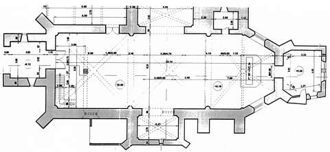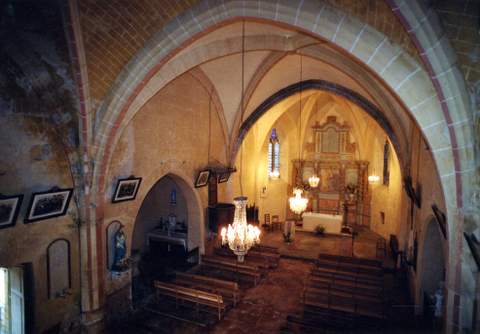 L’intérieur de l’église est à nef unique de deux travées, prolongée par une abside pentagonale. Une tribune occupe une partie de la première travée et donne accès à la partie haute du clocher où sont suspendues, sous une belle charpente, deux grosses cloches d’égale dimension, l’une du XIXe s., l’autre datée de 1489. Le chœur et la seconde travée sont voûtés de pierre sur croisées d’ogives ; les clefs de voûte sont armoriées. La voûte de la première travée est faite de briques et porte en clef de voûte les initiales L P. Elle date de 1878, comme la sacristie, construite derrière le chœur, et a été réparée vers 1920 comme en témoignent les matériaux utilisés. Les chapelles latérales ont été construites au milieu du XIXe siècle. Percées d’une baie étroite, voûtées d’ogives et peintes, elles ouvrent sur la nef par deux grandes arcades ogivales. L’une est dédiée à la Vierge, l’autre, à l’est, à saint Joseph. À l’ouest, l’appendice, de bel appareil, voûté de pierre, qui jouxte le mur nord de la chapelle, est sans doute l’élément le plus ancien, seul témoin d’un édifice qui a précédé l’église gothique. Il a longtemps servi de sacristie.