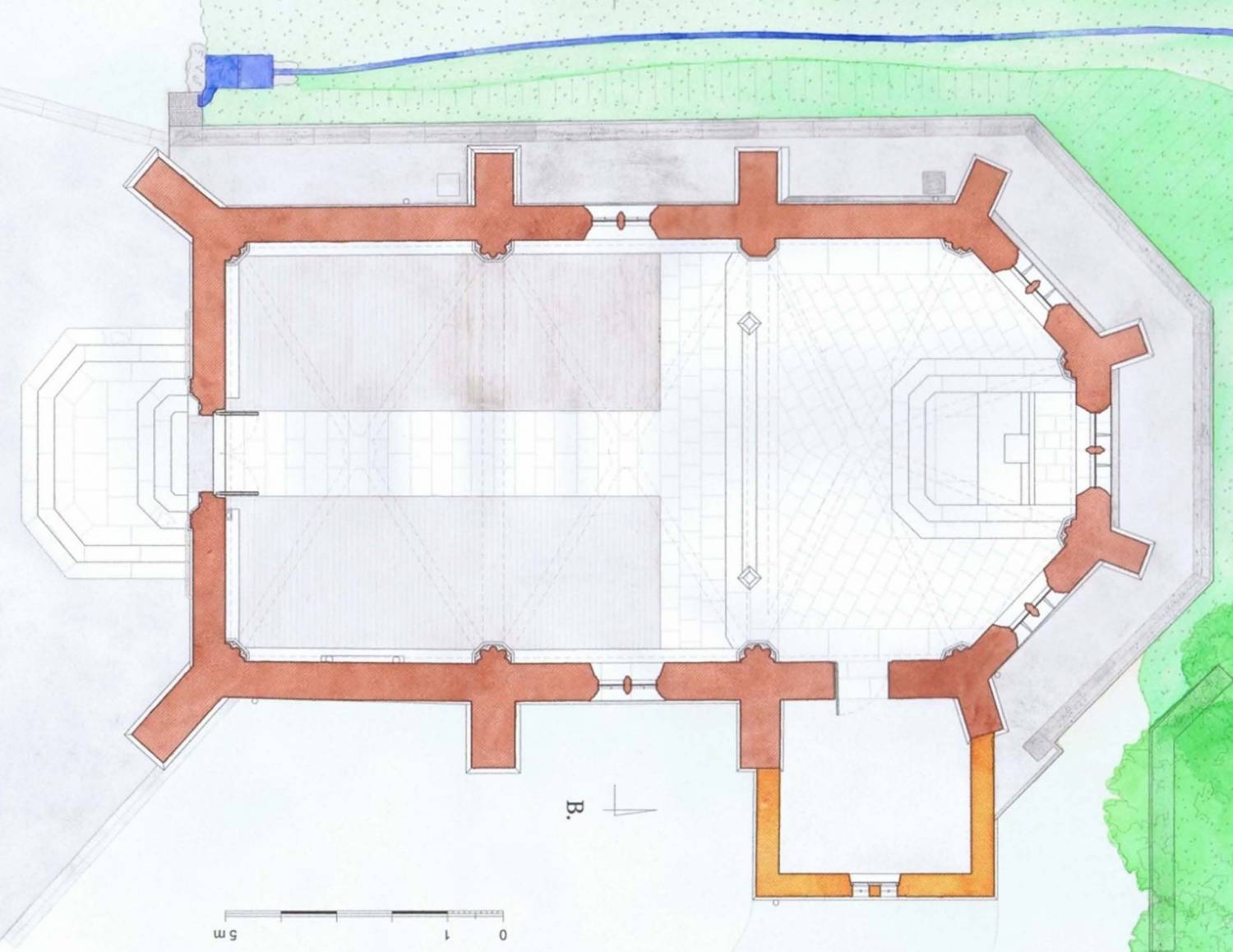 De ce premier édifice, il ne subsiste que la rosace de la façade occidentale, réintégrée dans l’édifice reconstruit au XVI° siècle.