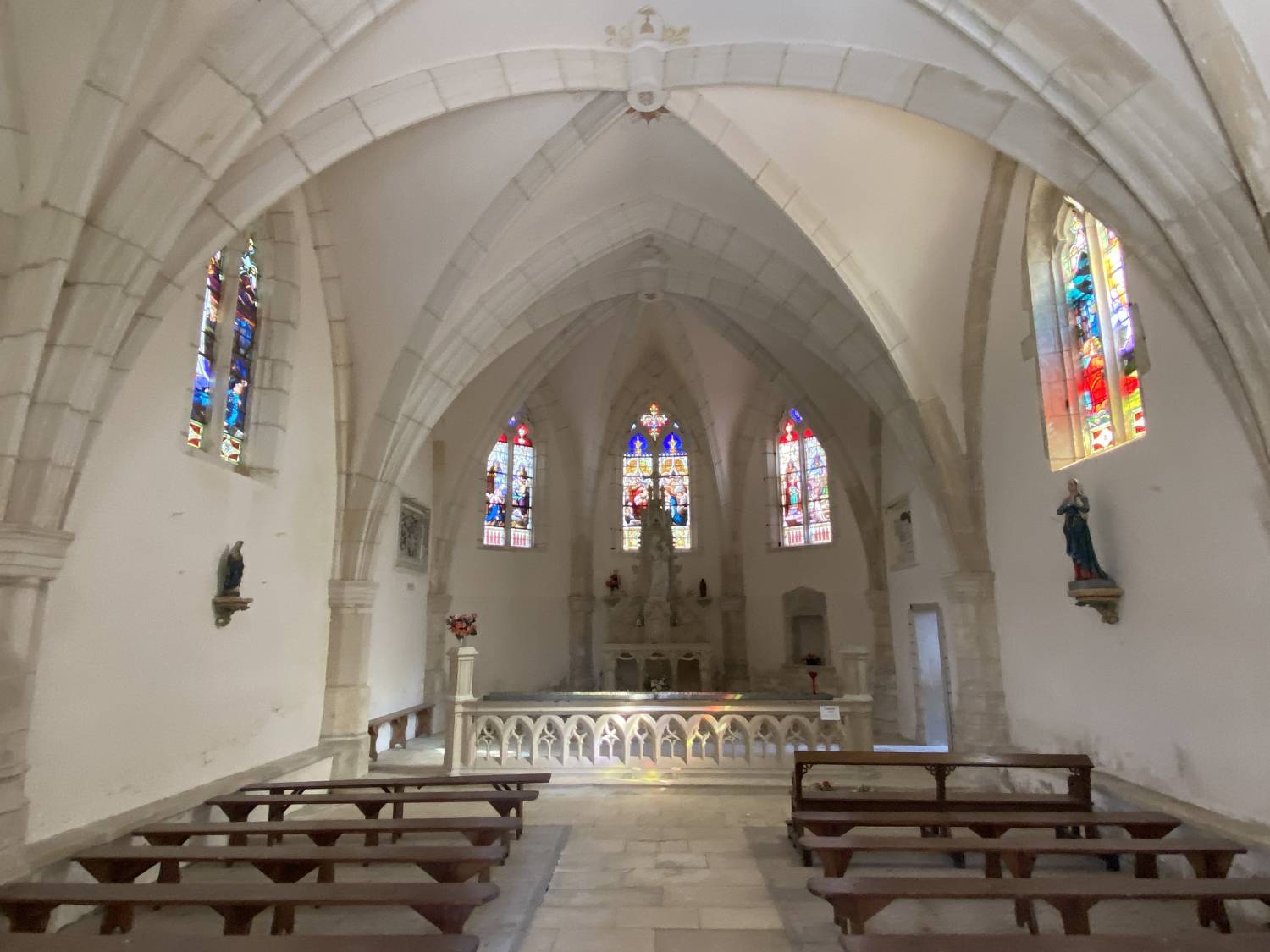 Les vitraux du chœur (Présentation, Annonciation et Couronnement de la Vierge) ont été posés en 1880. Le maître Autel et la table de communion ont été placés au cours des années 1860-1870.