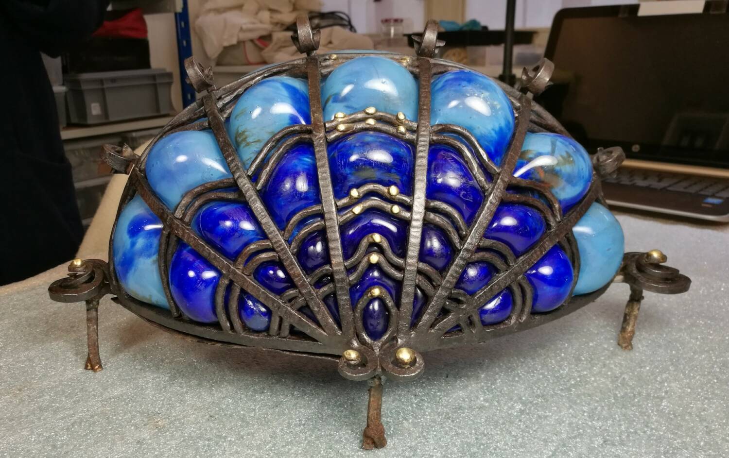 Concernant l’état de conservation, chaque bénitier semblait présenter des altérations communes : un empoussièrement plus ou moins important, surtout localisé dans les creux, ainsi que de légères rayures. En outre, le rebord gauche de l’un des bénitiers était brisé. Ce bénitier présentait également des fissures qui le traversaient à différents endroits. Le verre était sain : que ce soit à l’intérieur de la vasque ou à l’extérieur, il n’était pas attaqué chimiquement. L’autre bénitier ne présentait d’altérations mécaniques ou chimiques (en tout cas sur les parois externes de la vasque) et était en très bon état structurel. Seuls des dépôts exogènes de type calcaire étaient.