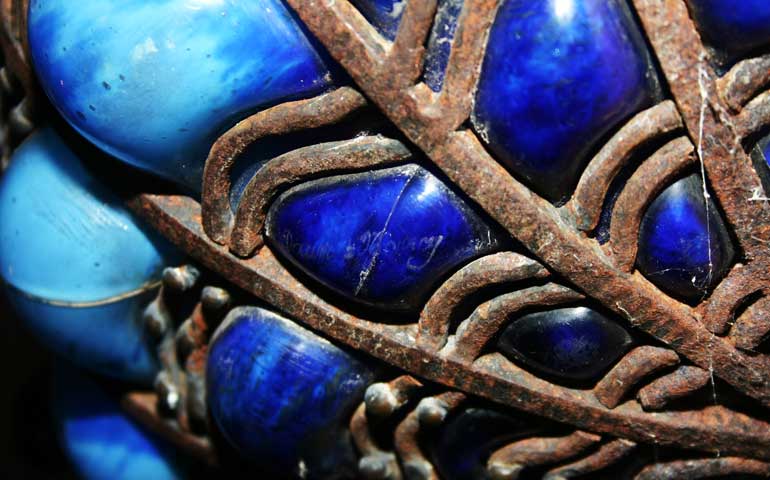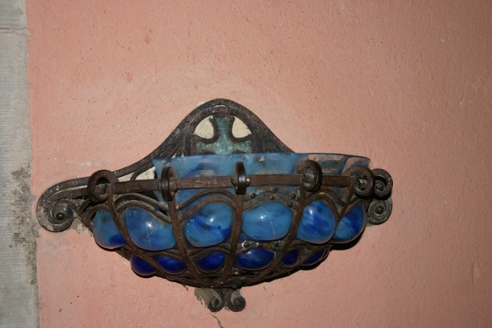 Chaque bénitier est formé d’une corbeille de fer forgé plaquée au mur, aux formes très simples évoquant les ondes. Soufflée à travers les ouvertures de ce treillage de métal, une coupe de verre se gonfle en bulles irrégulières. Le dégradé des bleus plus ou moins foncés et translucides est du plus bel effet. Une croix émaillée plaquée sur le mur surmonte la coupe. La vasque Nord est signée : « Daum Nancy ».