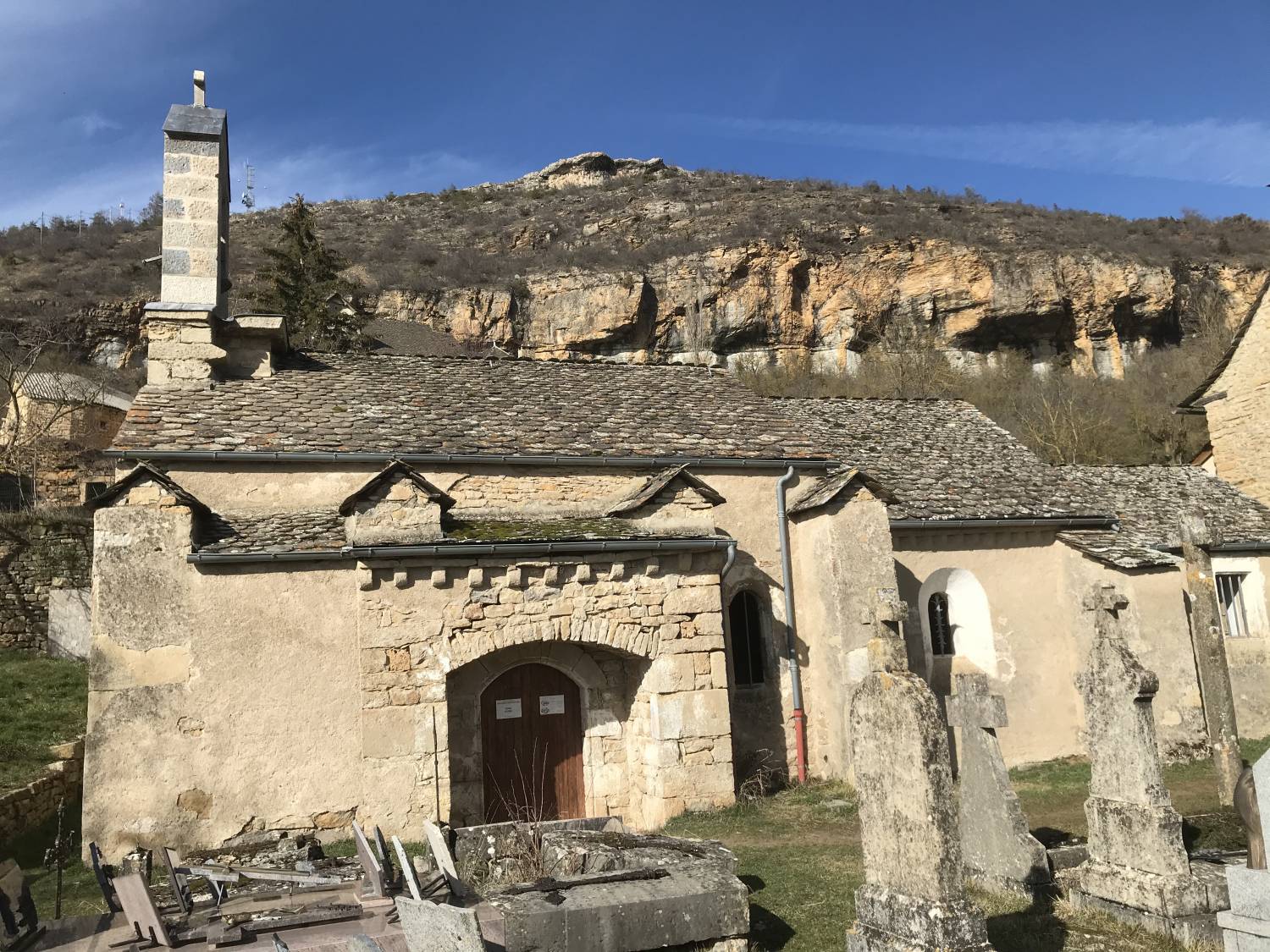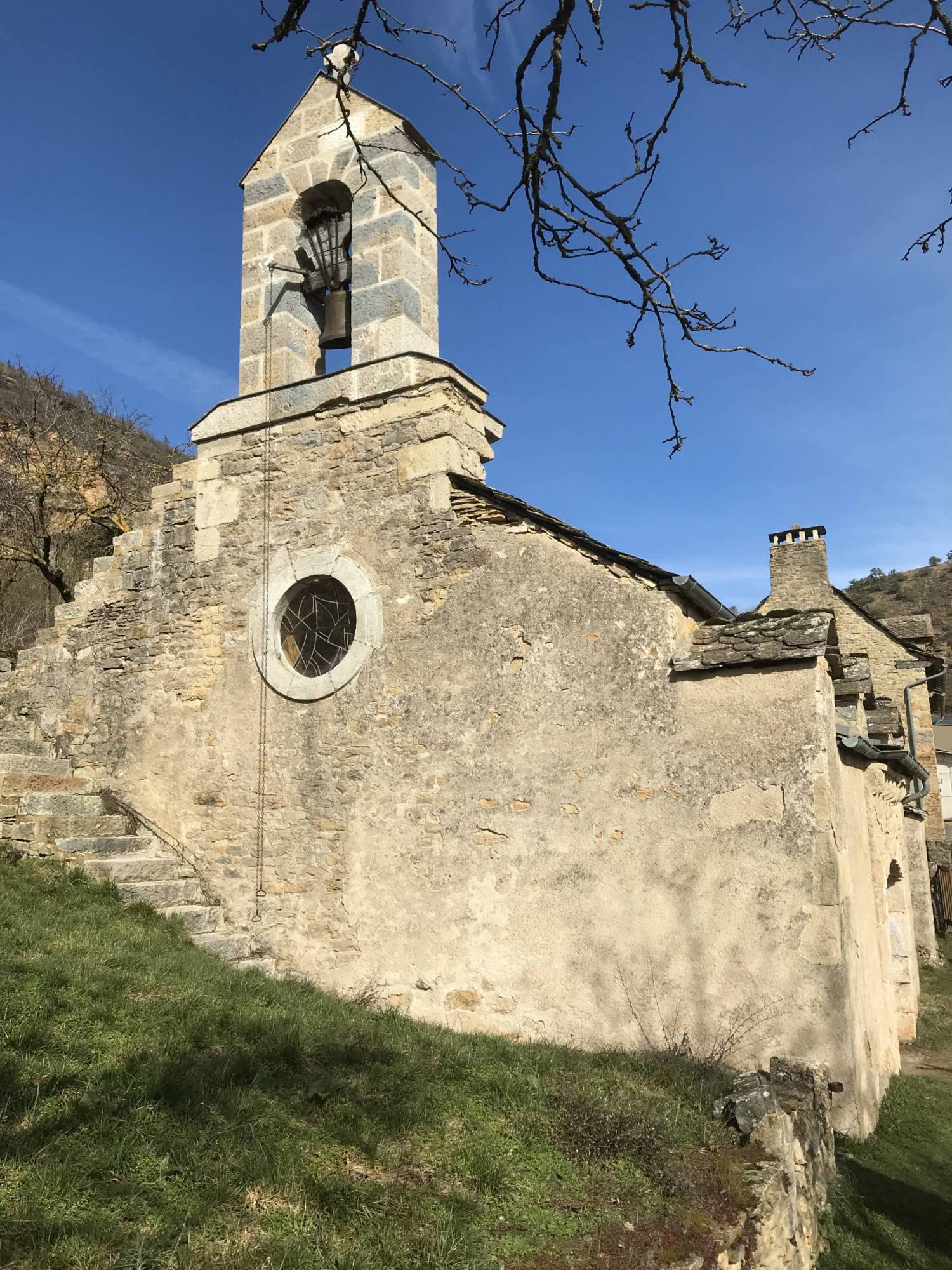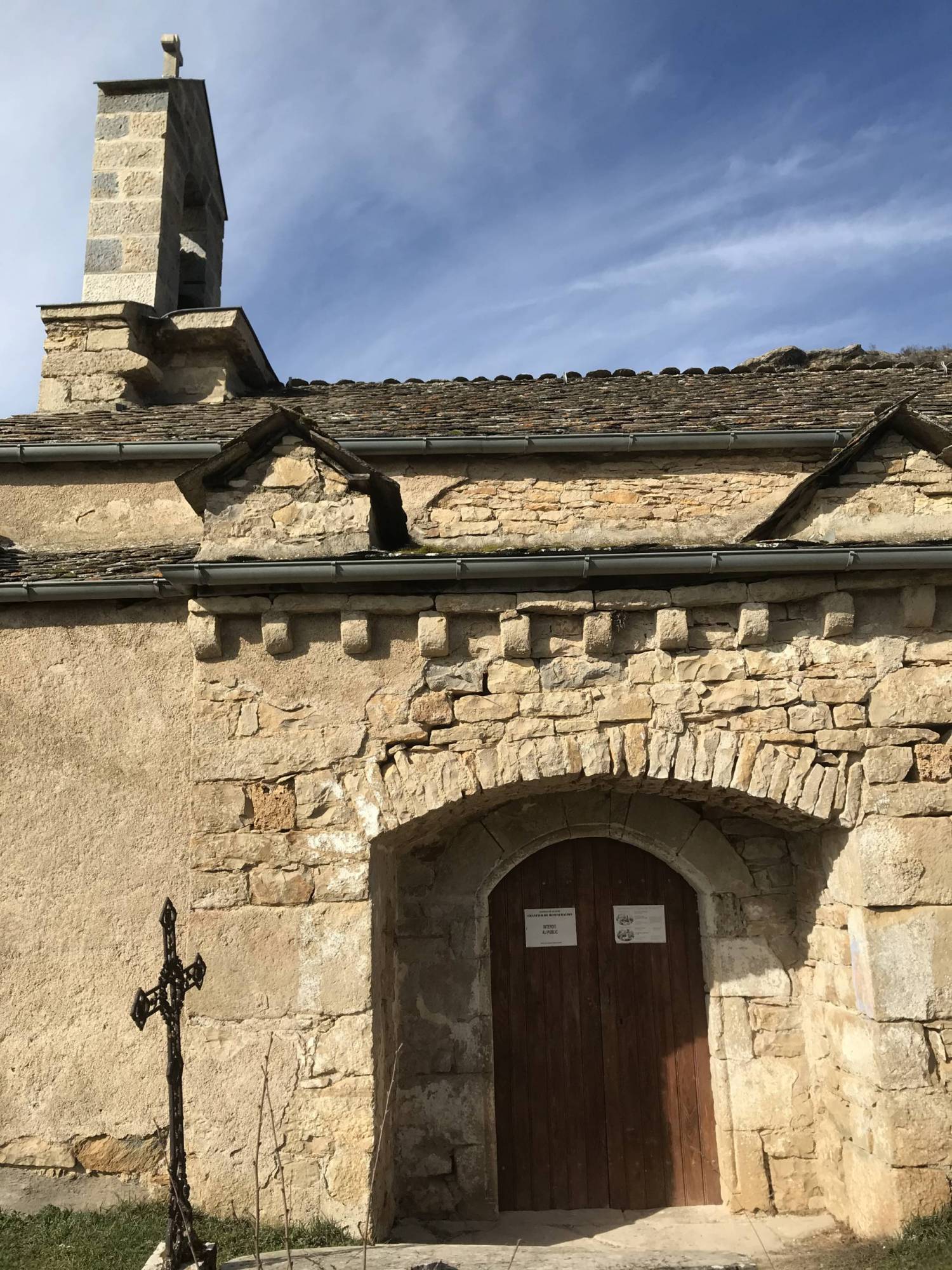 Un porche orné de modillons nus permet d’accéder à l’église le long de la façade sud. Les murs sont en moellons enduits et les couvertures en lauzes.